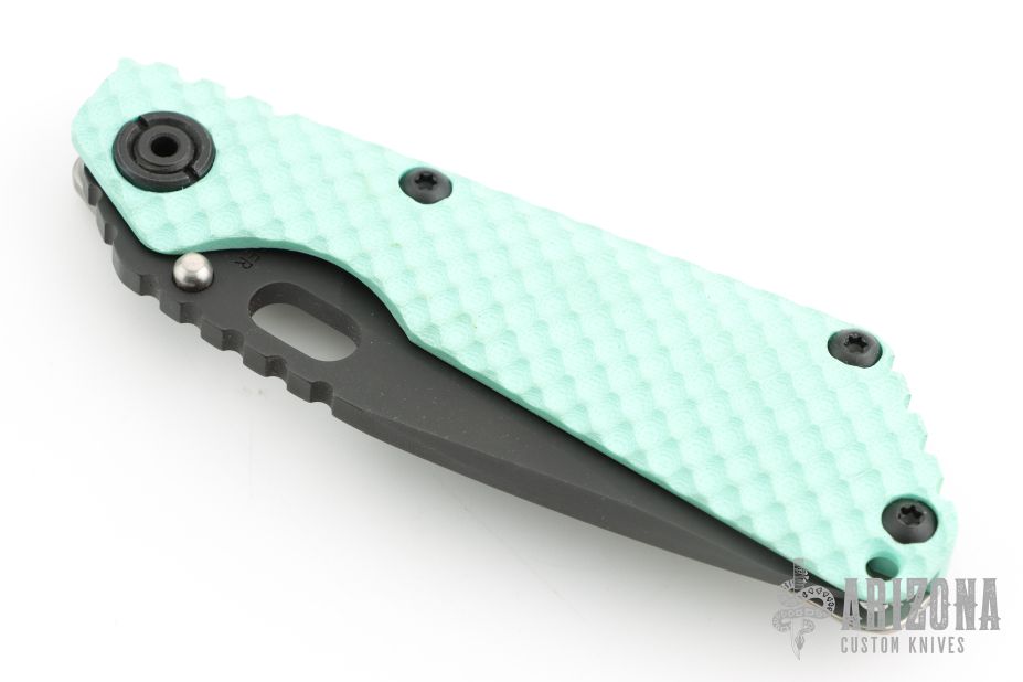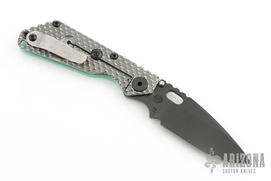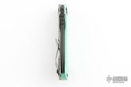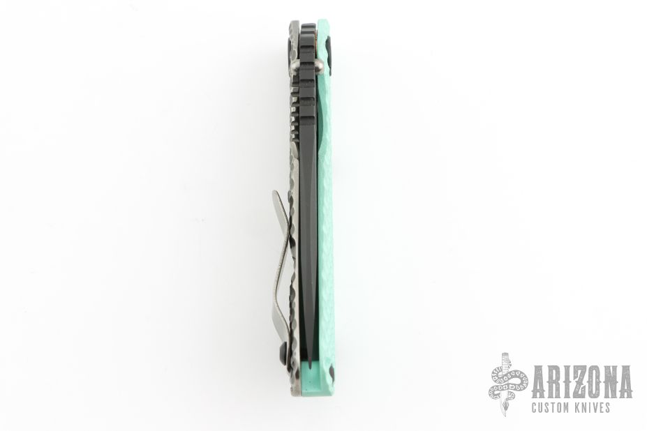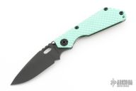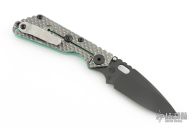 This SNG DGG by Strider has a black finished spear point blade with dual thumb studs, thumb hole, and notched thumb rest. Handle is TactiBlue G-10 and bead blast finished titanium "Gunner Grip", lockbar stabilizer, and titanium tip up clip. Nice detent, lockup and blade seating. New condition.