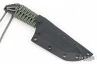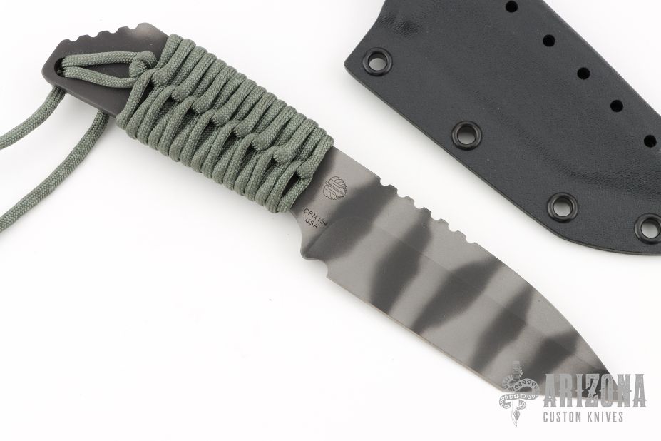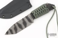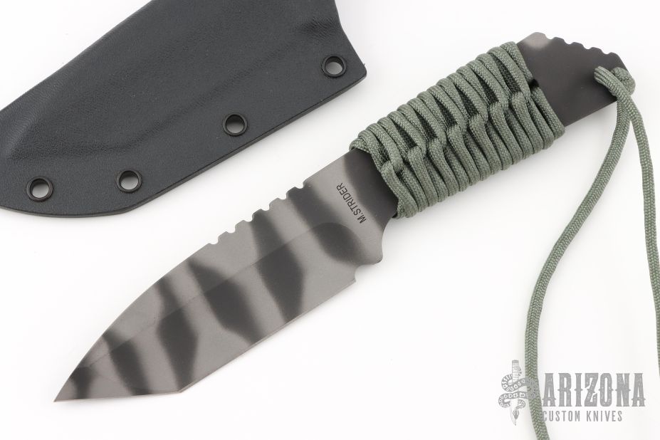 This knife by Mick Strider features a tiger striped tanto blade with a notched thumbrest, .207" blade stock and 1.380" blade depth, full tang construction. The handle has a cord-wrapped grip. Comes with a kydex sheath. New condition.