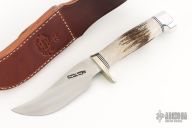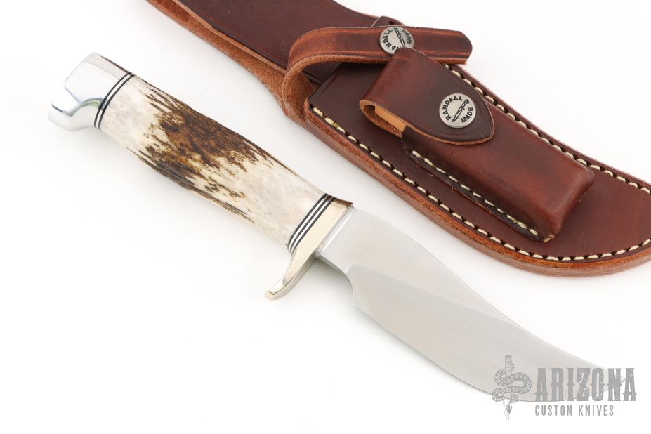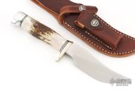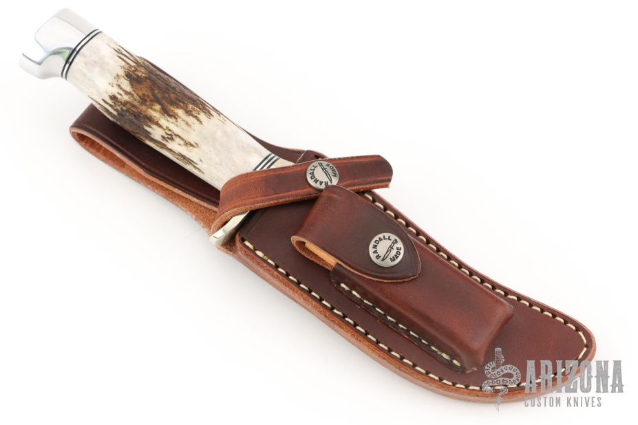 This Model 22 Outdoorsman by Randall Made Knives features a satin finished blade with notched thumbrest, .177" blade stock and 1.279" blade depth, hidden tang construction. The Model 22 is a thinly-beveled blade for the professional outdoorsman. The handle has a nickel silver guard, stag grip, black/duralumin spacers, duralumin butt. Comes with a brown leather sheath and original paper wrapping. New from maker!