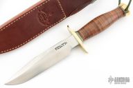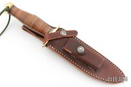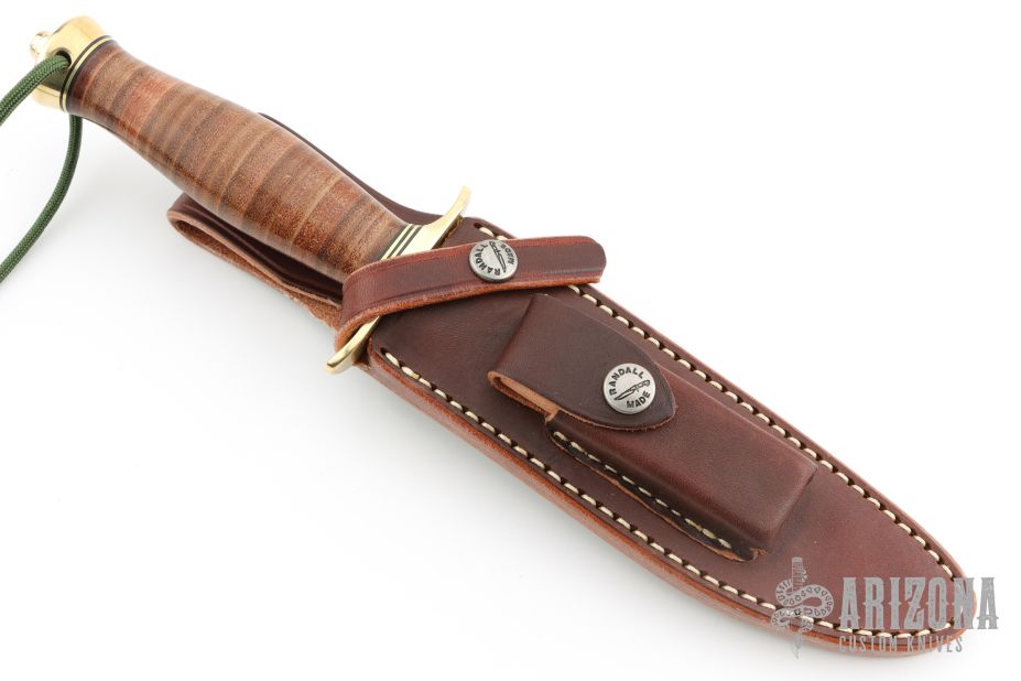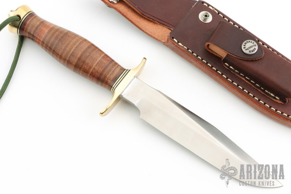 The Model 1 Fighter by Randall Made Knives has a satin finished blade with sharpened top edge, .227" blade stock and 1.201" blade depth, hidden tang construction. The handle has a brass double guard, stacked leather finger grip handle with black/brass spacers, brass butt with lanyard hole. Comes with a brown leather sheath and original paper wrapping. New from maker.