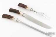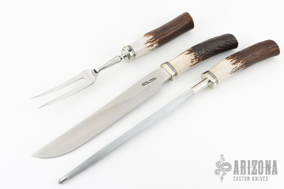 "Designed to meet every requirement as the ideal table knife, it is rustproof and will resist staining as ordinary blades do when used in carving meat. Complete with high-quality stag handled Sharpening Steel and Fork. A three-compartment felt case is included. " Satin finished blade with .165" blade stock and 1.159" blade depth, hidden tang construction. Nickel silver guards with stag grips and black/duralumin spacers. Comes with cloth rollup, and original papers. New from maker!