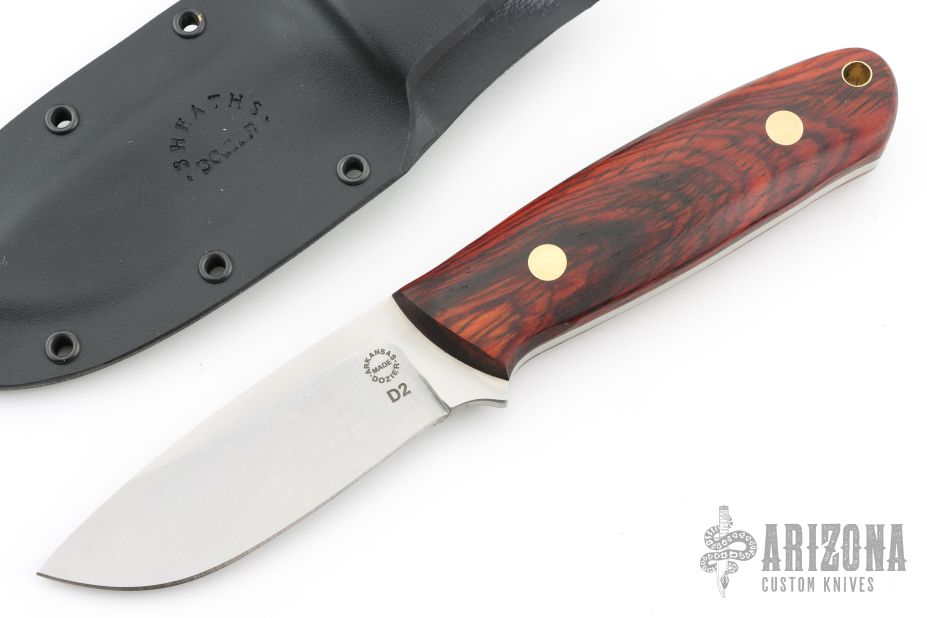 This KS-1 Master Skinner by Dozier Knives features a satin finished blade with .160" blade stock and 1.122" blade depth, full tang construction. The handle has cocobolo scales with brass pins and lanyard hole. Comes with kydex sheath with belt clip. New from maker.