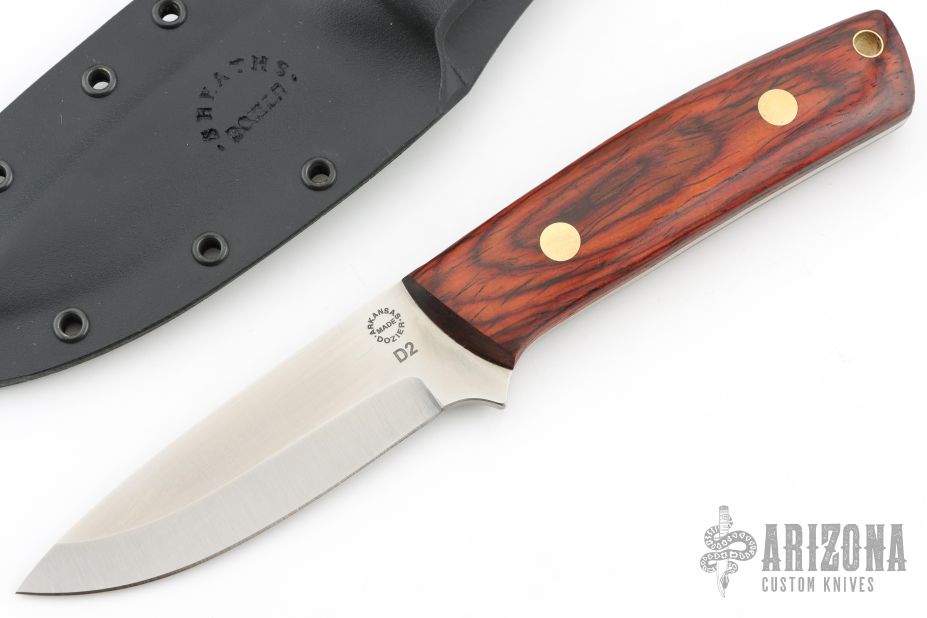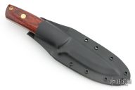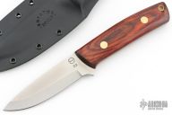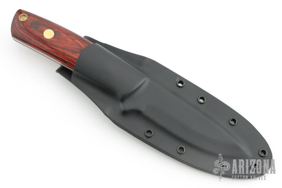This K-36II by Dozier Knives features a satin finished blade with .125" blade stock and 1.040" blade depth, full tang construction. The handle has cocobolo scales with brass pins and lanyard tube. Includes kydex sheath with belt clip. New from maker.