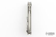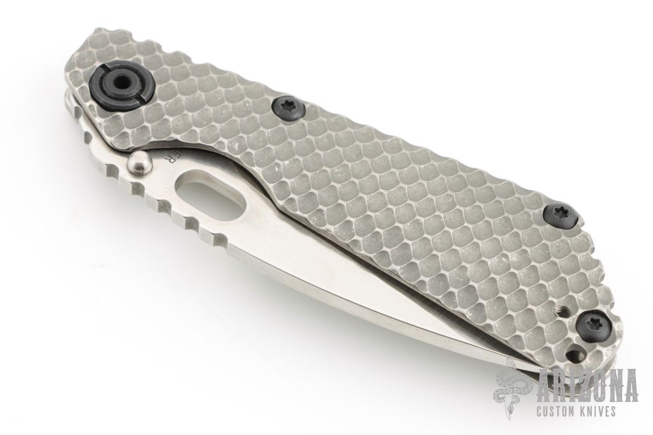 This SNG DGG by Strider has a hand ground satin finished blade with dual thumb studs, thumb hole, and notched thumb rest. Handle is bead blasted titanium "Gunner Grip", lockbar stabilizer, and titanium tip up clip. Nice detent, lockup and blade seating. Excellent condition.