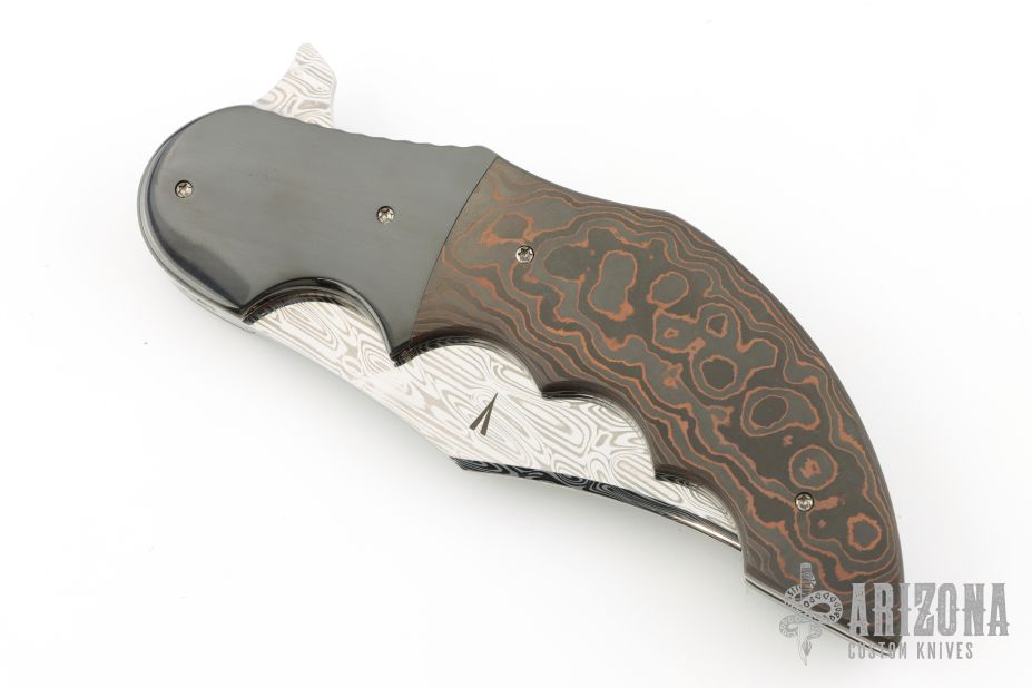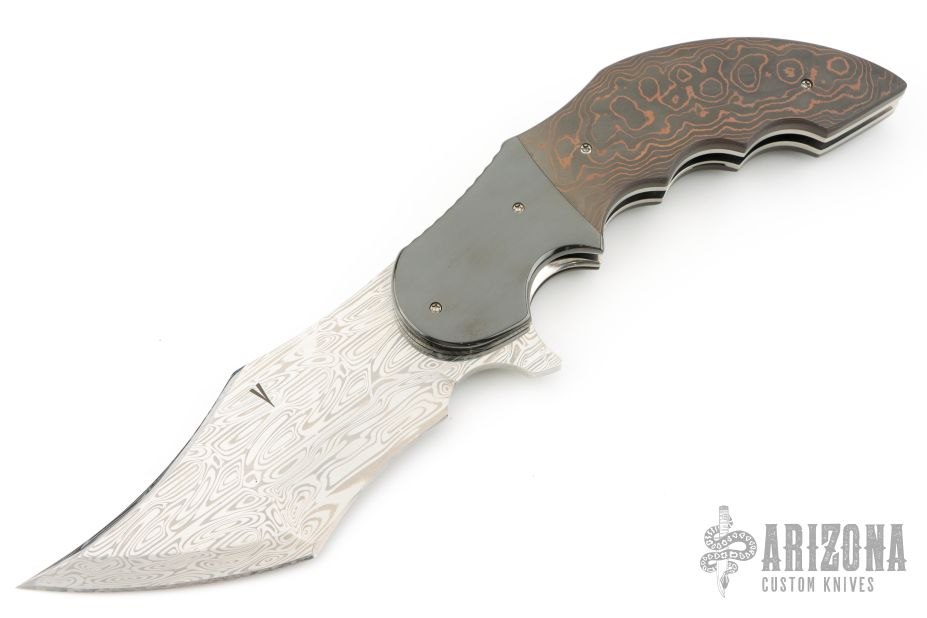 "Each blade is handmade by me in the USA using manual machines. I specialize in hard use tactical folders with the best materials I can get my hands on. My current blade steels are RWL-34, stainless steel Damascus, and San Mai. I use various materials that include Titanium, Carbon Fiber, Zirconium, MokuTi, Timascus."