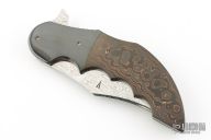This Double Homicide framelock flipper by Jeff VanderMuelen features a Lodi pattern Damasteel blade with flipper. The handle has Zirconium bolsters, fat carbon copper fiber scales, polished titanium liners, zirconium standoffs, zirconium clip with hidden screws, tip up carry. Rides on bearings, nice detent, lockup and blade seating. Comes with a zippered case, COA and patch. Inside of frame is dated 8/2021, signed and marked #120. Has a couple light scratches otherwise Excellent condition.