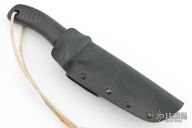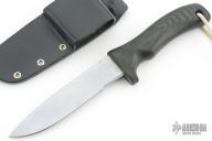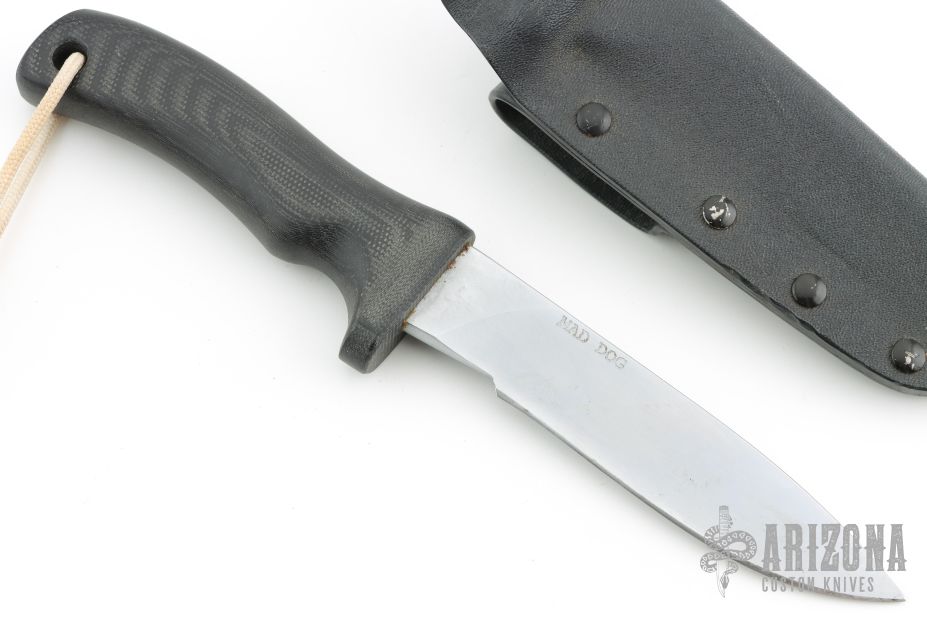 This Baby Mako by MadDog Knives features blade with .252" stock and .995" blade depth, hidden tang construction. Selectively tempered, the ATAK has a Rockwell C-scale hardness of 62 at the edge (as hard as a file), and HRC 50-54 throughout the spine and hidden full tang. Hard chrome blade finish. The black G-10 handle is designed to be ergonomic and has the ability to withstand tremendous punishment with little or no damage. It is hard and tough enough to be used as an impact tool. Includes a kydex sheath with belt loop. Has been used, has some scuffs and some small oxidation spots, otherwise good condition.