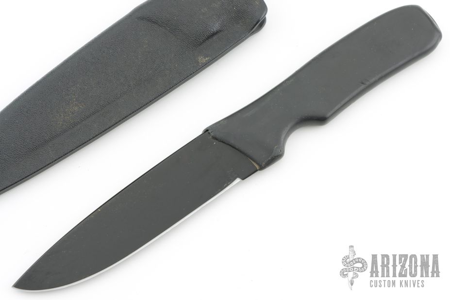This Mirage X Micro by Mad Dog knives features a ceramic blade with black coating, unlike the "Frequent Flyer" which has a black G-10 blade. Has .221" blade stock and 1.137" blade depth, hidden tang construction with rubber coated handle. Comes with kydex neck sheath with no metal connectors. This knife is sterile and non-magnetic. Has some scuffs and some marks on the handle, has a couple small chips in the blade edge, otherwise good condition.