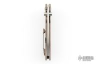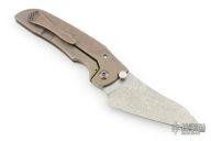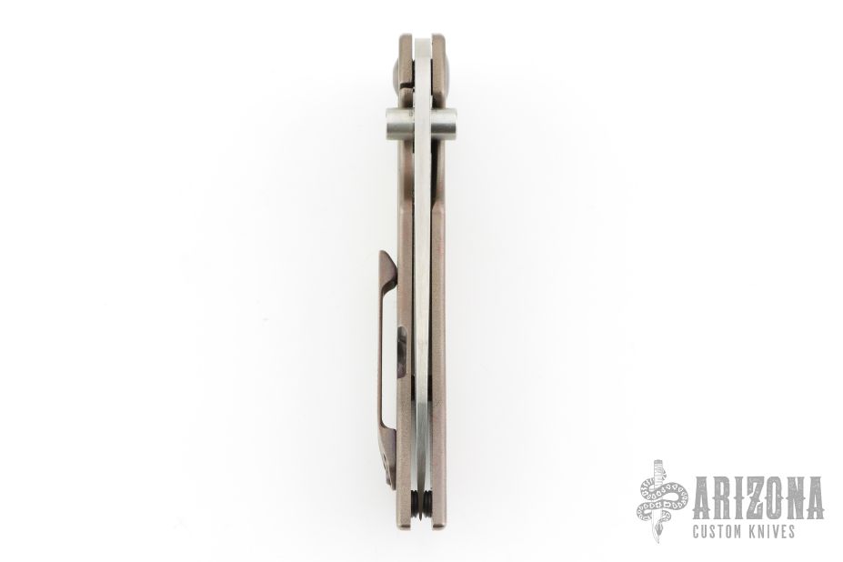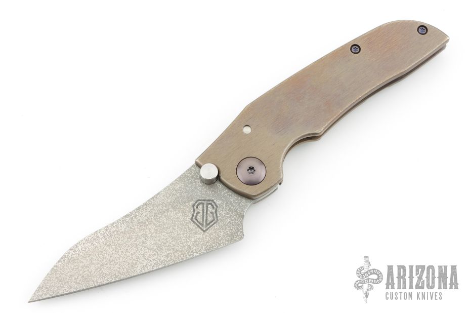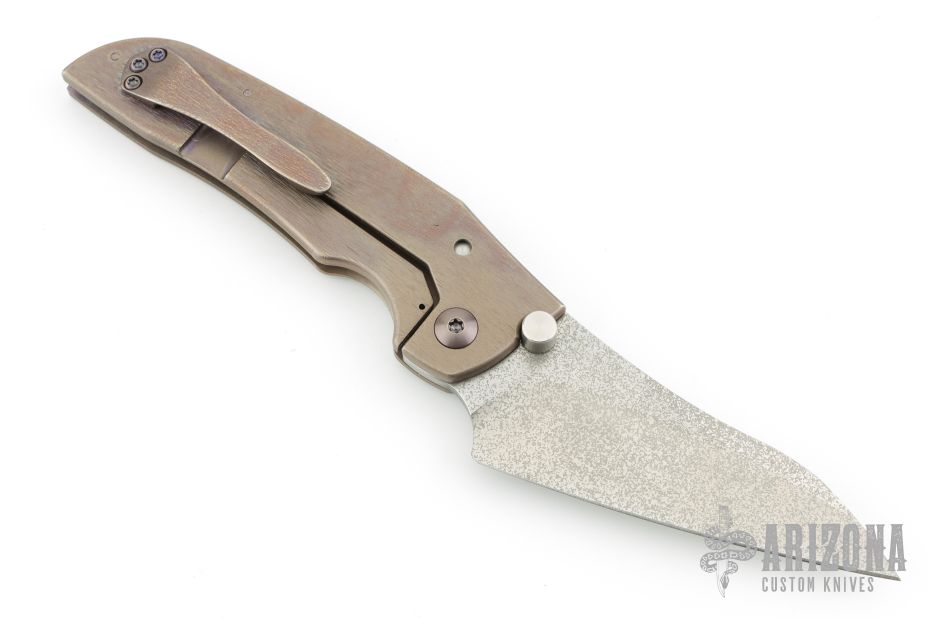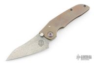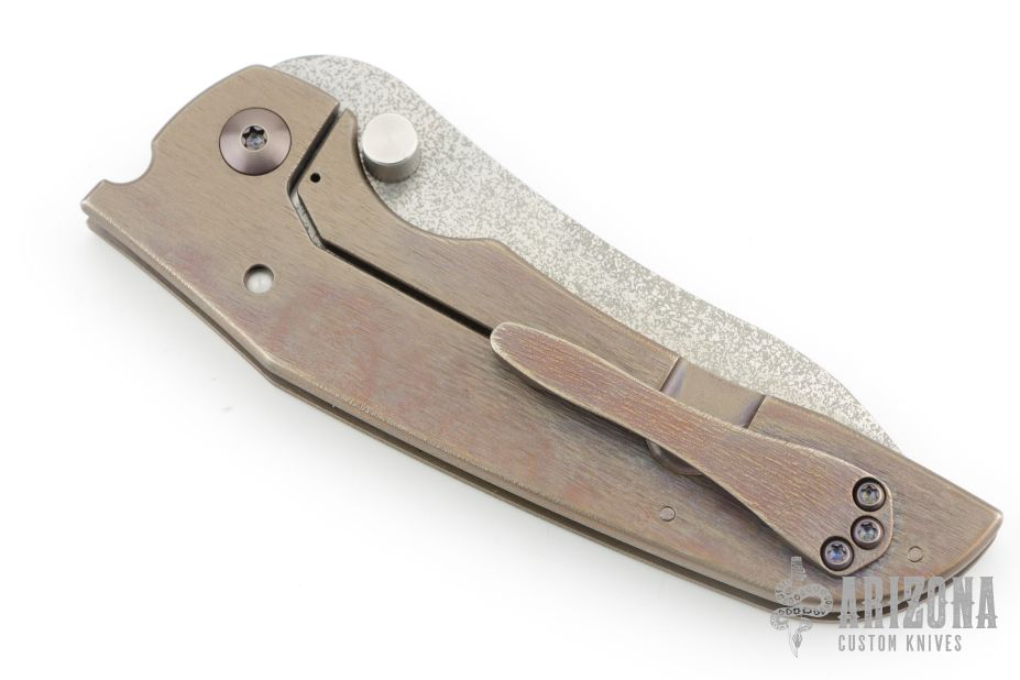 This Thuck by John Gray Knives features a "dark rain" satin finished blade with dual thumb studs. The handle has a bronze textured titanium frame with matching tip up clip. Nice detent, lockup and blade seating. Rides on bearings. Comes with a zippered case and COA dated 3-21-2024. Excellent condition.