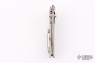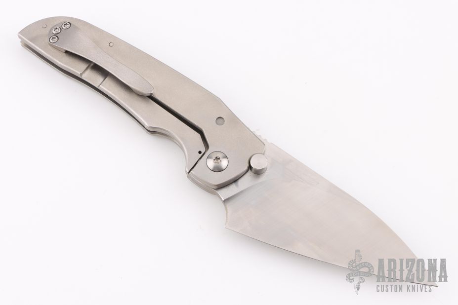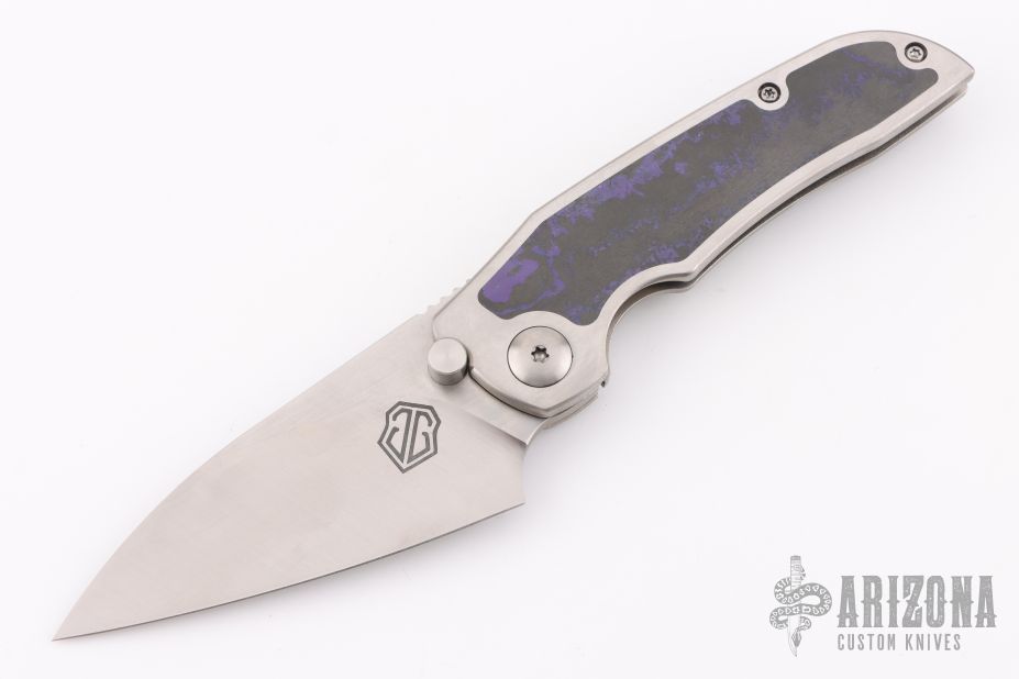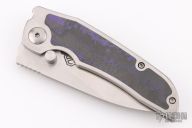This Phat Thuck by John Gray Knives features a satin finished Magnacut blade with dual thumb studs. The handle has an orange peel finished titanium frame with purple camo carbon inlay, and textured titanium tip up clip. Nice detent, lockup and blade seating. Rides on bearings. Comes with COA dated 07-21-2024. Excellent condition.