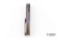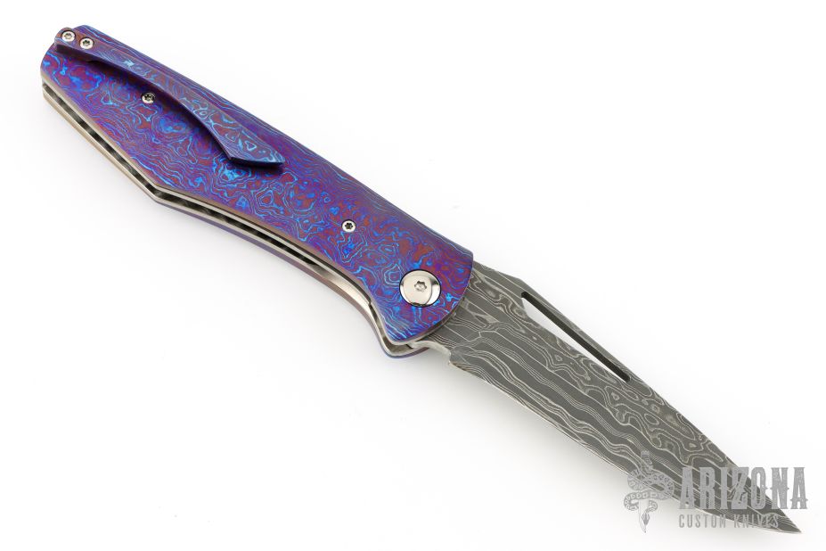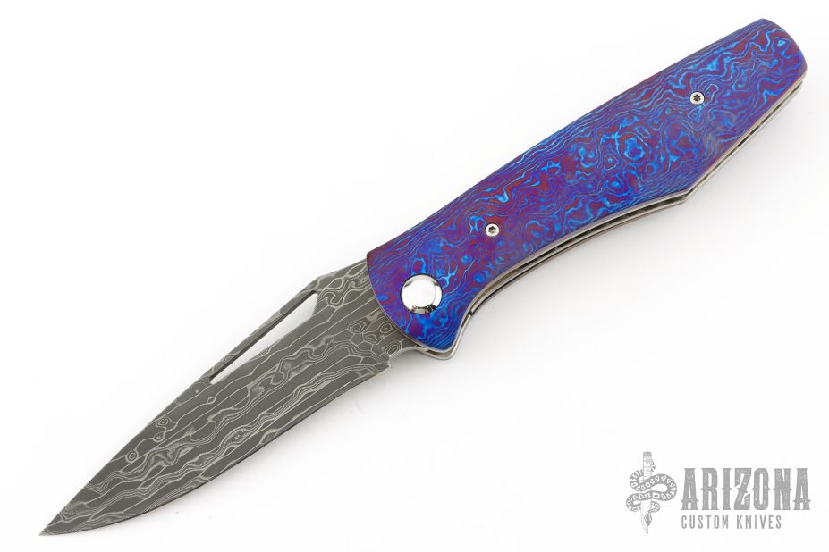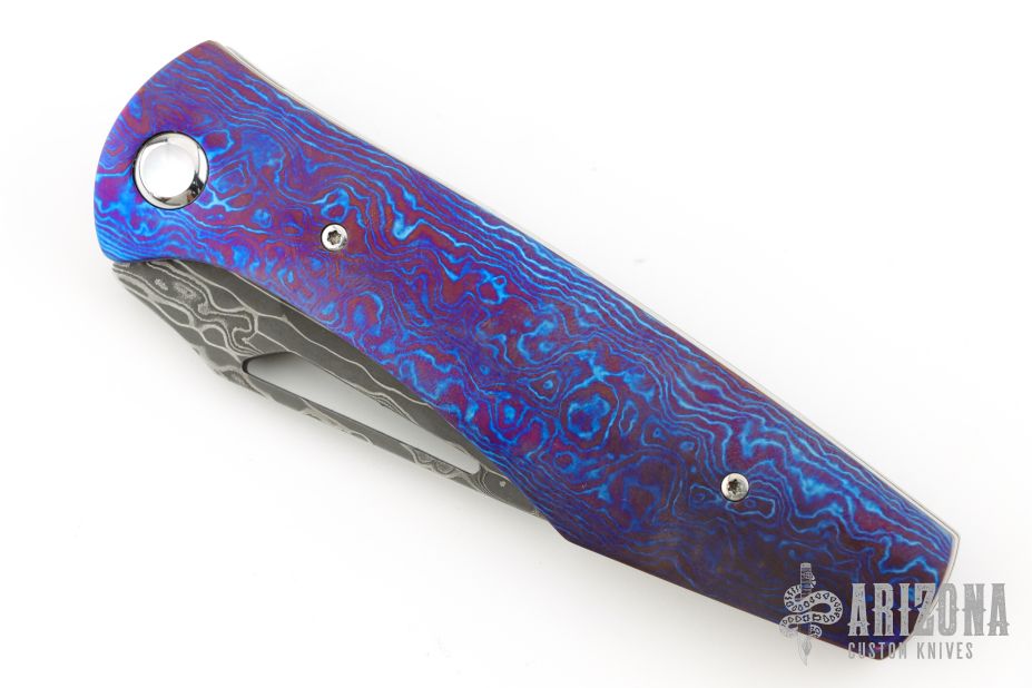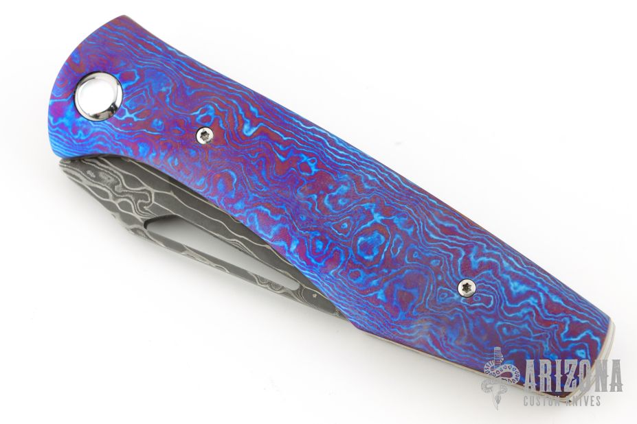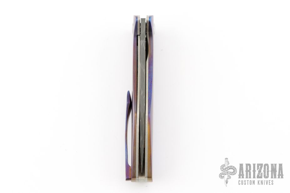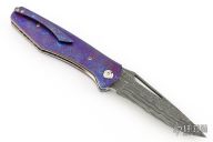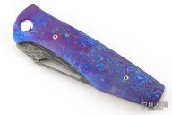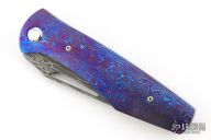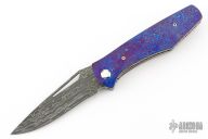 This Umpqua Scale Release D/A Auto from William Tuch features a Damascus blade with thumbhole. The handle has timascus scales, textured titanium liners with jeweled interiors, matching titanium backspacer, mother of pearl inlay in the pivot, tip up timascus clip. Nice detent, lockup and blade seating, strong action. Comes with a zippered case. Excellent condition.