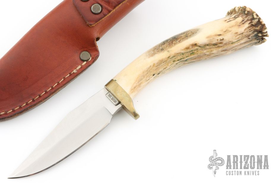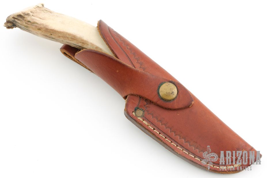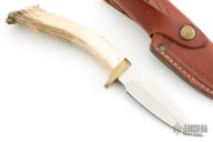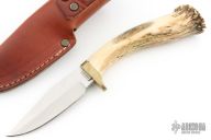 This Limited Edition Bird Knife by Silver Stag features a satin finished blade with false top edge, .160" blade stock and 1.125" blade depth, hidden tang construction. The handle has a brass guard and crown stag grip. Comes with brown leather sheath. Excellent condition.