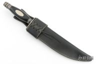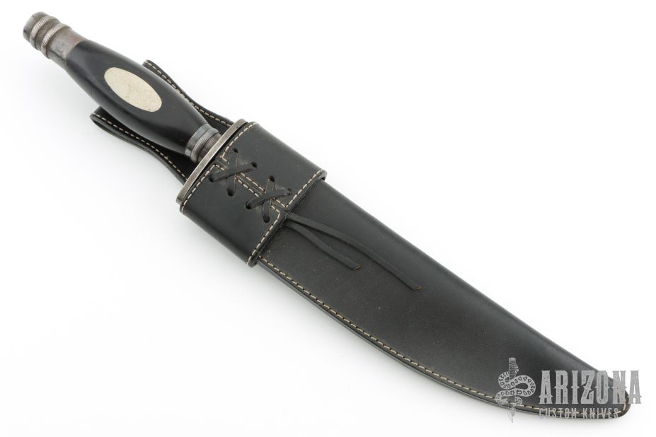 The Dixie Gun Works Bowie has many features of the Searles knife; a ¼” high carbon steel blade, “single edged…not curved, “9 ¼” long, 1 ½” wide, hardened to 57-59 Rc with a hand rubbed satin finish. A nickel silver plate inlaid into the back of the blade just ahead of the guard has “Dixie Gun Works” engraved in script where Daniel Searles put his name. The handle is dense, black, African ebony with an oval nickel silver escutcheon on each side. Guard and butt are silver plated brass. Each knife includes a top quality, heavy black leather sheath with white stitching and laced belt loop. These knives are hand made in Italy Exclusively for Dixie Gun Works and represent the very best in old world craftsmanship. Overall length 14 ½” and weighs 18 oz. Has some oxidation/staining on the blade, otherwise good user condition.