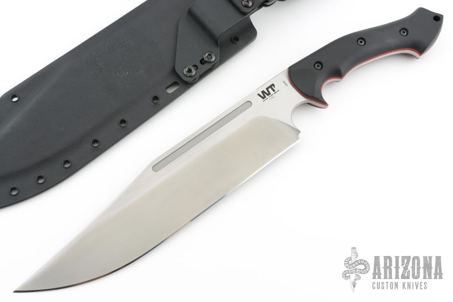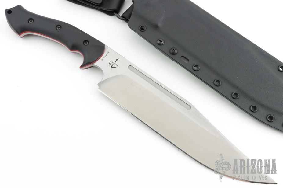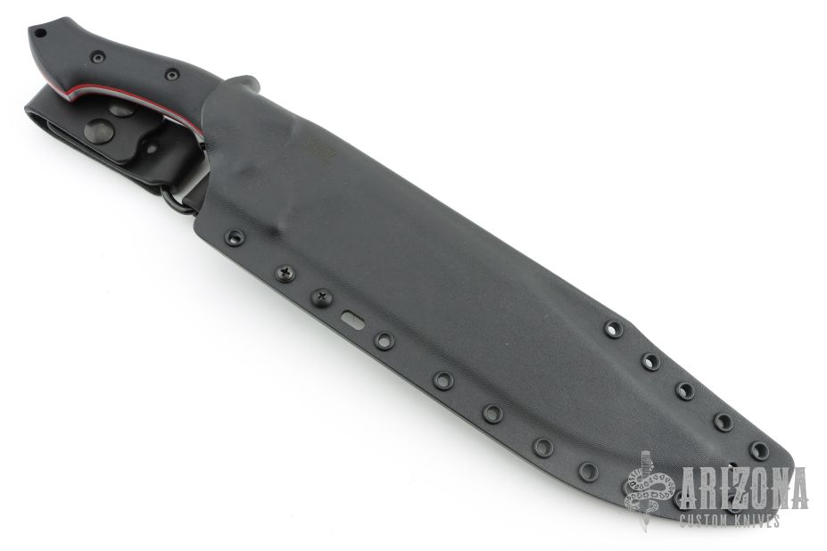 This BlackOut HD by Work Tuff Gear features a satin finished SK85 Steel blade with a saber grind that has a convex cutting edge, has fullers, .188" blade stock and 2.240" blade depth, full tang construction with black G-10 scales with red G-10 liners. Comes with a kydex sheath with drop loop.