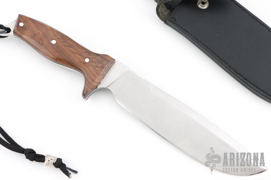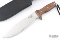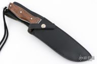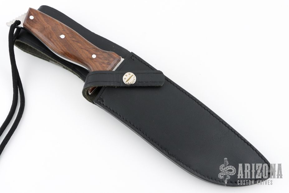 This Camp Knife by RBH Custom Knives features a satin finished blade with false top edge and notched thumbrest, .193" blade stock and 1.780" blade depth, full tang construction. The handle has wood scales with aluminum pins. Comes with a black leather sheath. Excellent condition.