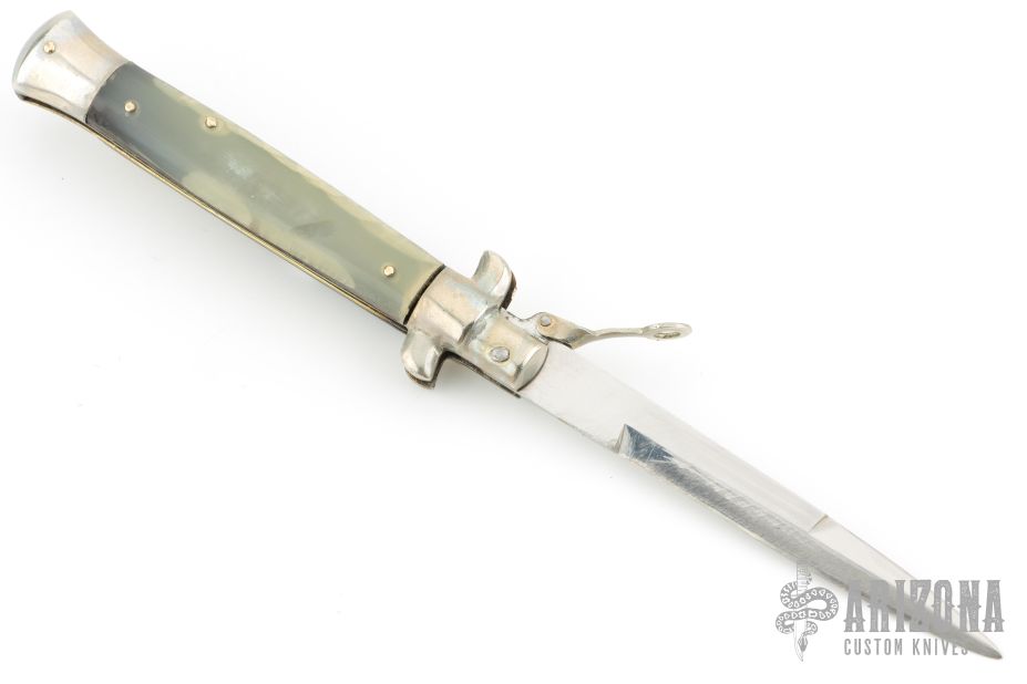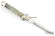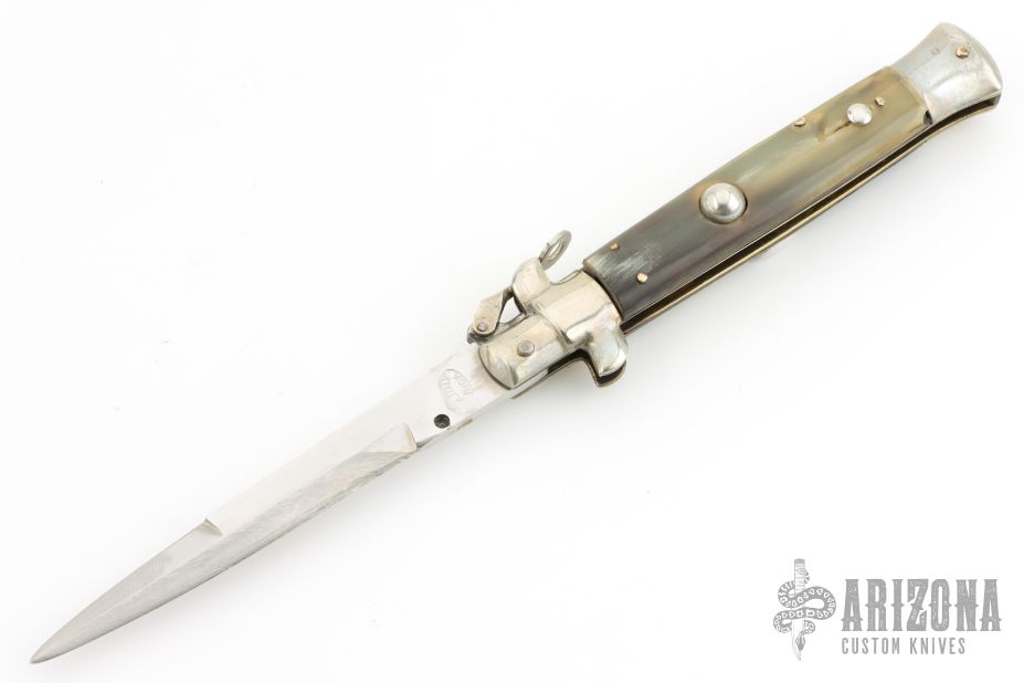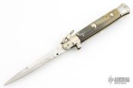 This picklock Auto from Mario Mauro features a mirror polished spear point blade with a false top edge. The handle has nickel silver bolsters and pommel with horn scales over brass D-stamp liners and steel backspacer.