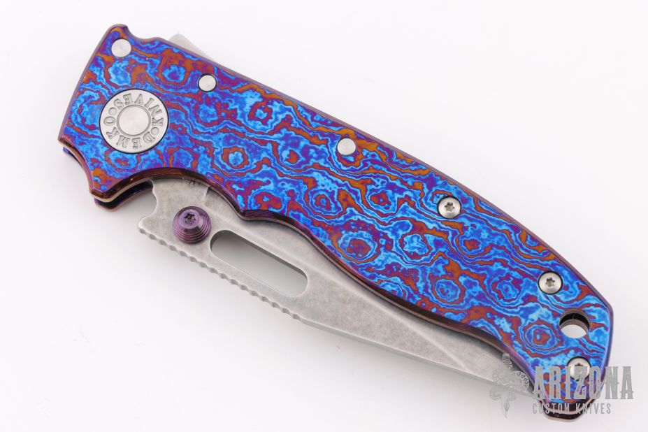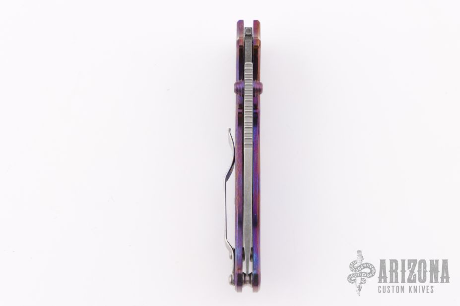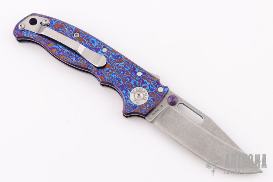 The AD20.5 by Demko Knives features the impressive Shark Lock and an even more impressive price point. The Shark Lock mechanism is situated on the spine of the knife and operated with a ramp-like ‘fin’, allowing you to flip the blade open and closed at will. It's probably the best thing about this knife and design, how quickly it can be deployed and ready for action. It acts as a blade launcher and a little wrist action is all it needs. This knife features a tumbled drop point blade with a notched thumbrest. The handle features a Timascus frame with a steel tip up pocket clip.