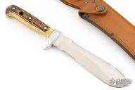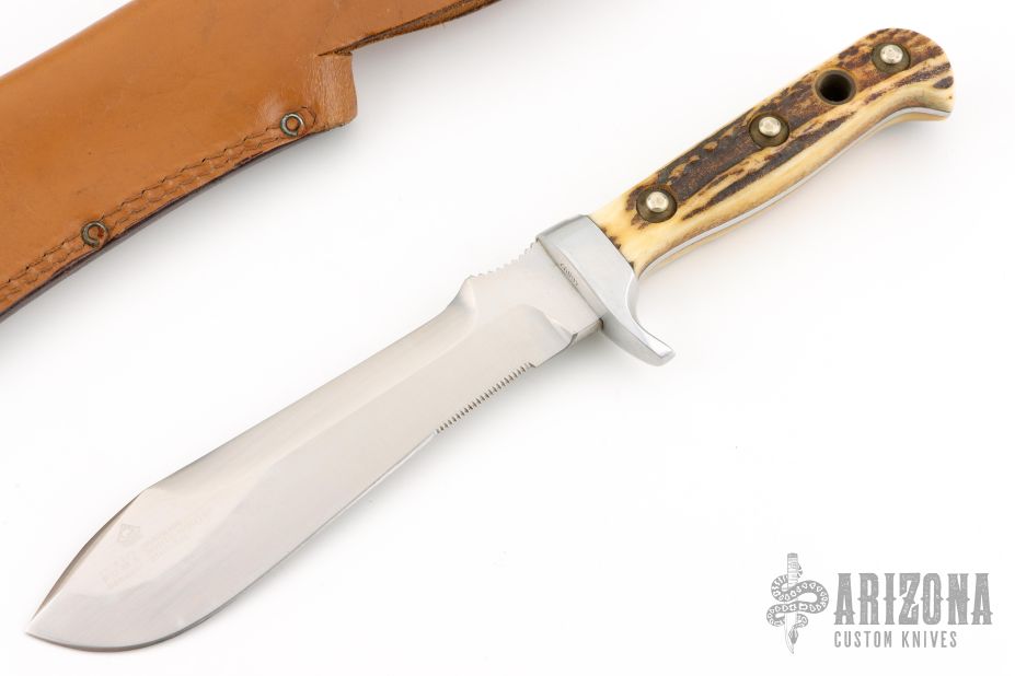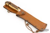 This White Hunter by Puma is the ultimate outdoorsman’s knife, originally designed by African professional hunters. It features a curved blade for cutting, slicing and skinning and a strong back edge for hacking. Handmade by skilled craftsmen with stag scales. #46092 on guard. Made in 1990. Comes with original brown leather sheath. Has some light scratches, excellent condition otherwise.