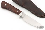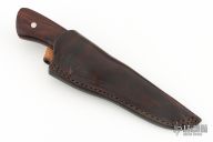 This hunter by Brett Gatlin features a hand rub satin finished blade with .226" blade stock and 1.163" blade depth, hidden tang construction. The handle has a satin stainless steel guard, desert ironwood burl grip. Comes with a brown leather sheath by Rowe's Leather. Has a couple small oxidation spots, otherwise excellent condition.