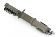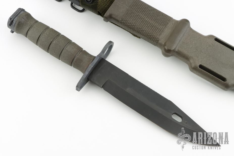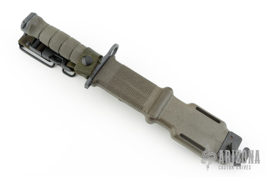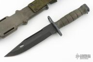 The M9 Bayonet by Lan-Cay features a black blade with sawteeth on the spine and hole in the blade that corresponds with the tab on the sheath to act as a wire cutter, .237" blade stock and 1.436" blade depth, hidden tang construction. The handle has a steel guard and butt with green nylon grip. Comes with original sheath. Has some light scuffs, otherwise excellent condition.