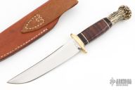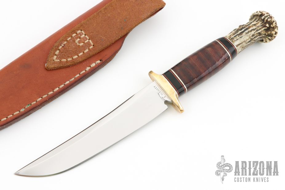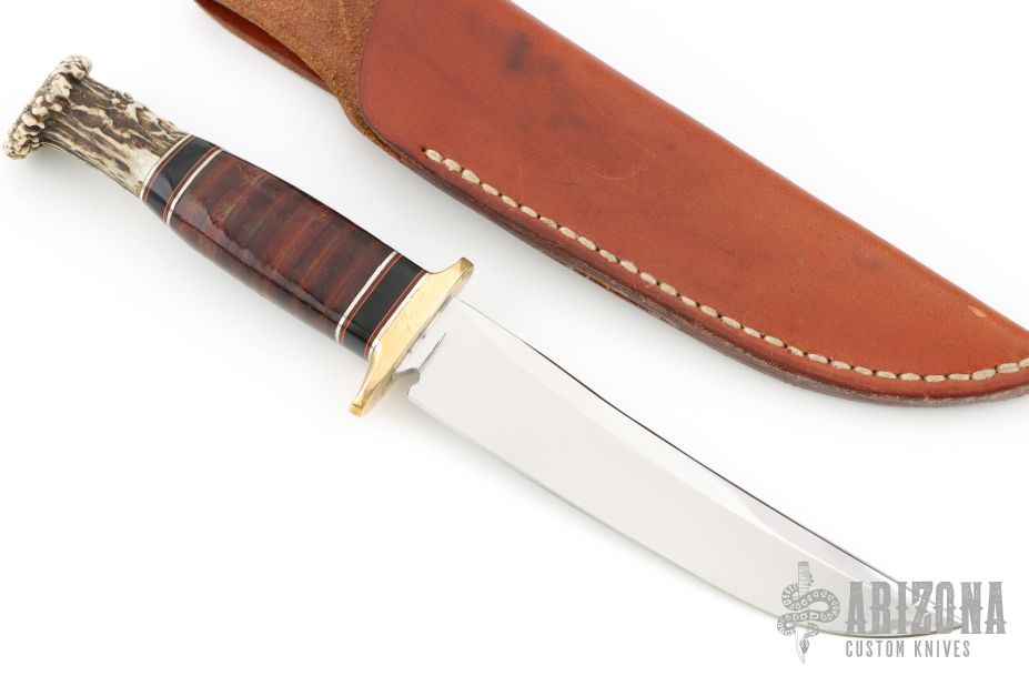This fighter by Zollan McCarty features a mirror polished blade with a sharpened top edge, .195" blade stock and 1.063" blade depth, hidden tang construction. The handle has a brass guard, crown stag butt with a stacked leather grip with nickel silver/red/orange/black spacers. Comes with a brown leather sheath and a zippered case. Has a couple light scratches, otherwise excellent condition.