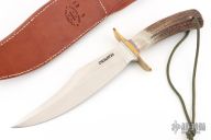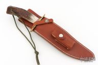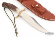 This Bear Bowie by Randall Made Knives features a satin finished blade with sharpened top edge, .236"blade stock and 1.712" blade depth, hidden tang construction. The handle has a brass guard, stag grip with brass butt, red/white/blue spacers. Comes with a brown leather sheath and original invoice from Randall dated 12/15/94. Comes with the original shipping box from Sullivan's Holster Shop. Excellent condition.