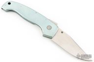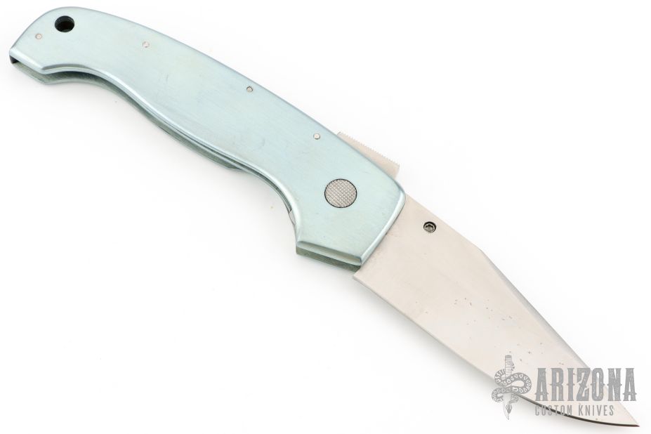 This Folding Bowie by Kit Carson features a satin finished blade with a checkered thumbstud and a notched thumbrest. The handle has anodized titanium scales and liner, black G-10 backspacer. Nice blade seating, lock up and detent. Has some scratches, otherwise good condition.