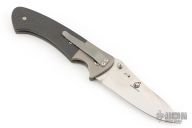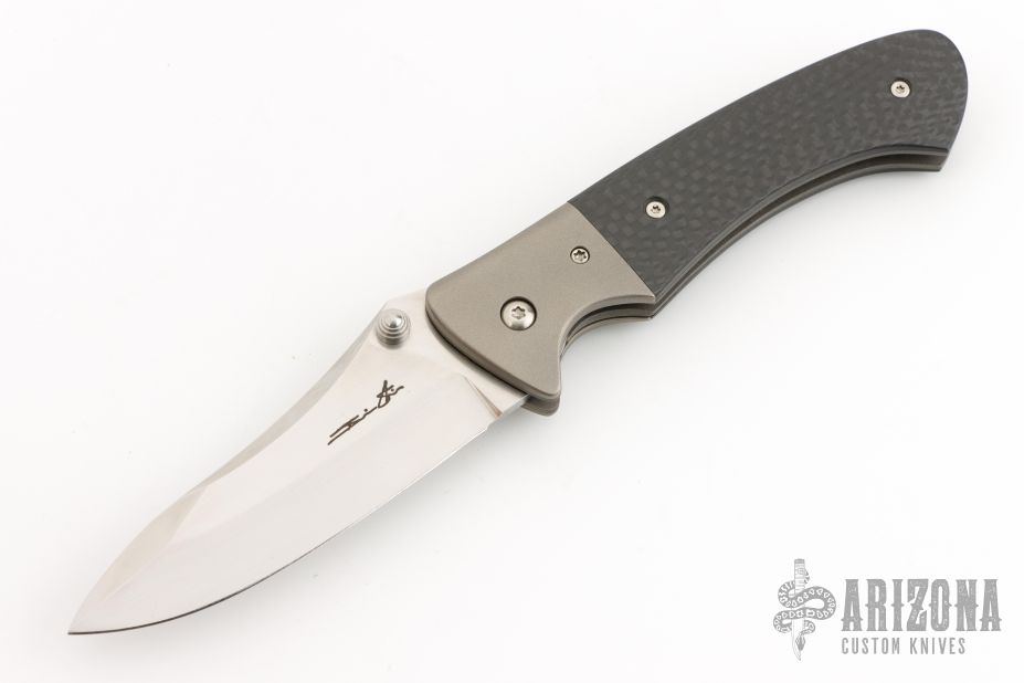This linerlock by Brian Tighe has a hand rub satin finished blade with dual thumbstuds. The handle has bead blasted titanium bolsters, carbon fiber scales, bead blasted titanium liners, tip down bead blasted titanium clip. Nice detent, lockup and blade seating. Excellent condition. Comes with a zippered case. #18 on the blade.