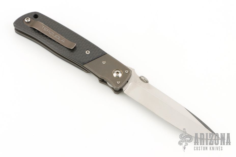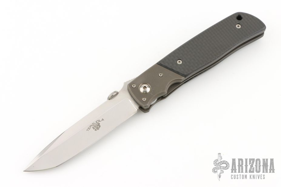 Bob Terzuola was born in Brooklyn, New York and attended New York University. Upon graduation in 1967 he went to Panama as a Peace Corps trainer and later became a jade carver and gemologist in the Motagua River Valley, Guatemala. In 1979, Terzuola began making knives and joined the Knifemakers' Guild in 1981 on an endorsement from Bob Loveless. Terzuola's first knives were fixed blade designs made for soldiers in Guatemala. Later that year moved to New Mexico and began making folding knives. Seeing a need for a knife that could be carried discreetly, he developed a model featuring black micarta for the scales and bead-blasted titanium bolsters. Innovations in desgin for which he coined the term "Tactical Knife". Bob attends many of the largest and well known custom knife shows across the world. Bob Terzuola Knives are known for their trademark design and high quality workmanship. Terzuola's most popular model is the ATCF, a folding knife design. This was his first tactical folding knife, although he also makes it with non-tactical materials. Other knife models that Bob Terzuola is popular for are the 3A, TT-1, Model 7, Eagle Rock 514, TTF3A, Model 26, Starmate, TTF3B, Pathfinder, Century Starfighter, Starmate, Battle Guard, TTF6, Model 18 Combat Master, WEE T, and Battle Mate, just to name a few. Bob Terzuola also designed a very popular knife for Spyderco, the SLIPIT. The SPLIT is made of the finest non-locking tactical folders on the market. Bob Terzuola has authored a book about the design of tactical knives named, 'The Tactical Folding Knife.' When you hear people say that Bob Terzuola literally wrote the book on tactical folding knives, he really did! Many custom tactical knifemakers have his book in their shop, and highly value his opinions and designs. Bob Terzuola has also authored articles about tactical knives and knifemaking for Blade, Soldier of Fortune and other publications.
