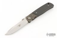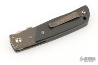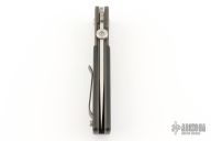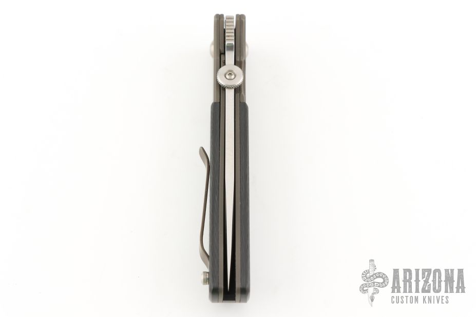 This TTF-5 from Bob Terzuola features a spear point blade with swedge, thumbdisc and a notched thumbrest. The handle has bead blasted titanium bolsters and liners, carbon fiber scales, black backspacer, tip up titanium clip. Has some light scuffs and scratches, otherwise excellent condition.
