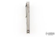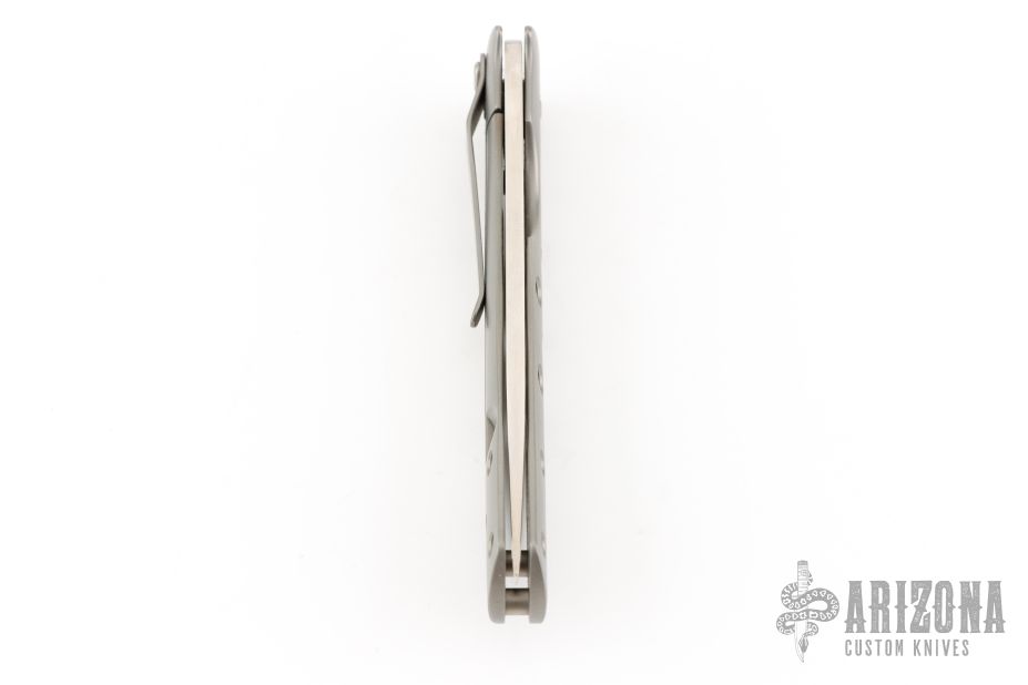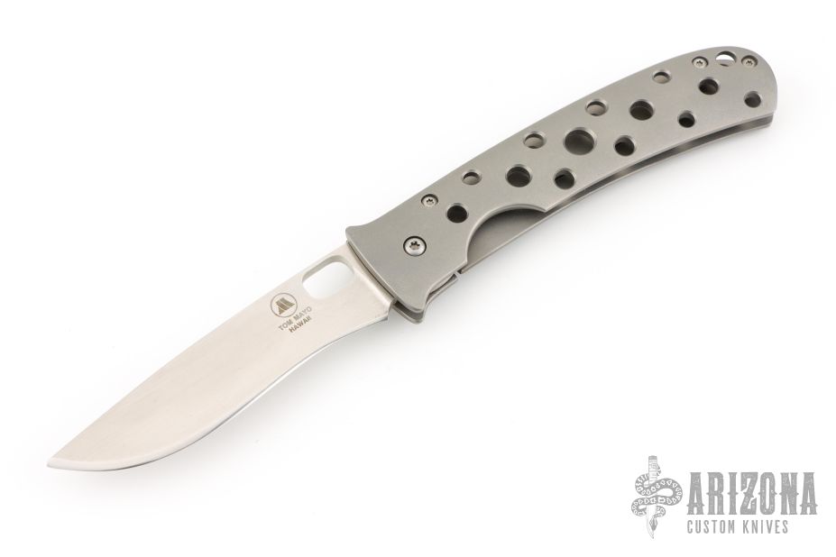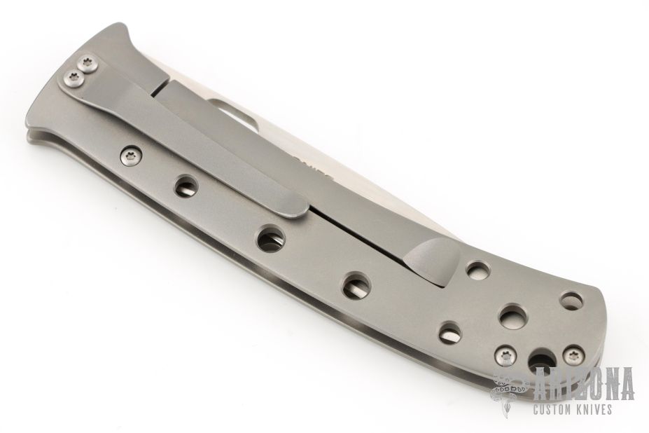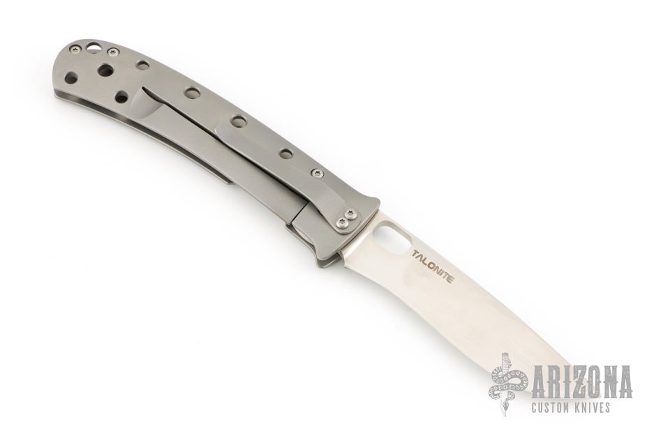 This TNT framelock by Tom Mayo features a hand rub satin finished recurve Talonite blade with thumbhole. The handle has a bead blasted titanium frame with hole pattern and a matching tip down clip, lanyard hole at the butt. Has a couple light scuffs, otherwise excellent condition. Nice detent, lockup and blade seating.