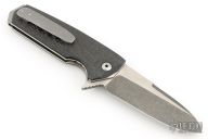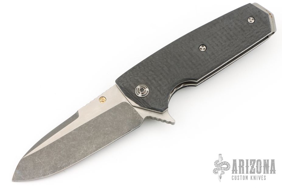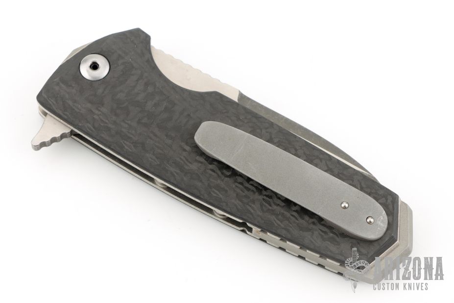 This Tank flipper by Allen Elishewitz features a two-tone blade with a notched thumbrest and flipper. The handle has carbon fiber scales, textured titanium liners, stainless steel backspacer and pommel, and a bead blast stainless steel clip, tip up carry. Has some scuffs and scratches otherwise good condition.
