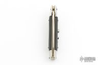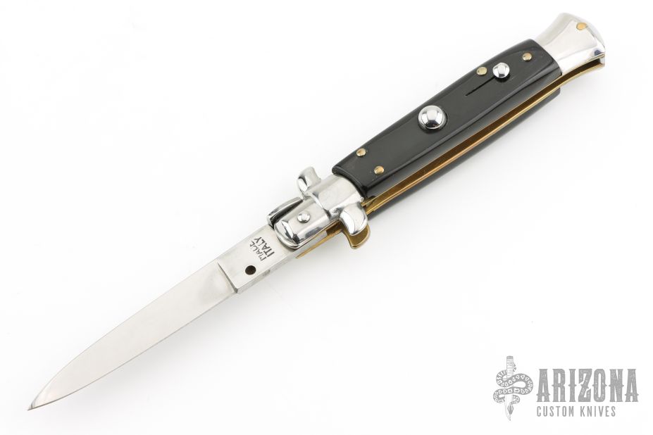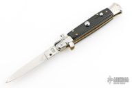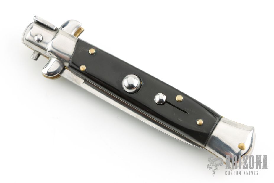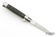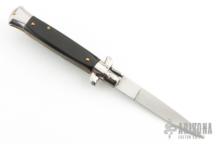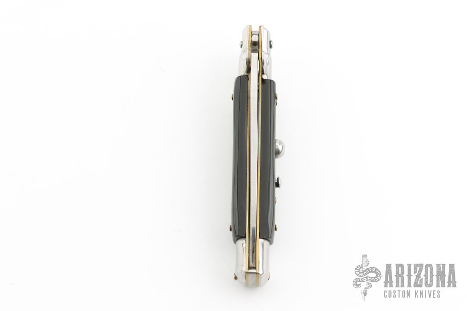 This Swivel Bolster features a tumble/polished finish drop point blade. The handle has nickel silver bolsters, front and rear, black delrin scales, brass liners, stainless spring. Has some light scratches, otherwise excellent condition.
