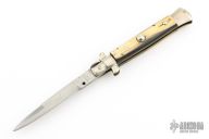 This Swivel Bolster features a tumble/polished finish bayonet ground blade. The handle has steel bolsters, front and rear, lavender acrylic scales, brass liners, stainless spring. Has some light scratches, otherwise excellent condition.