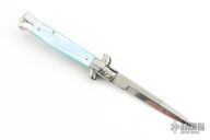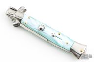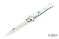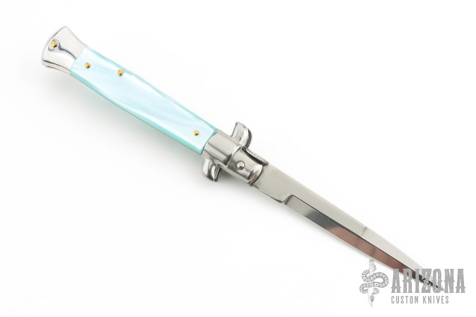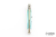 This Swivel Bolster features a tumble/polished finish bayonet ground blade. The handle has steel bolsters, front and rear, blue acrylic scales, brass liners, stainless spring. Has some light scratches, otherwise excellent condition.