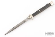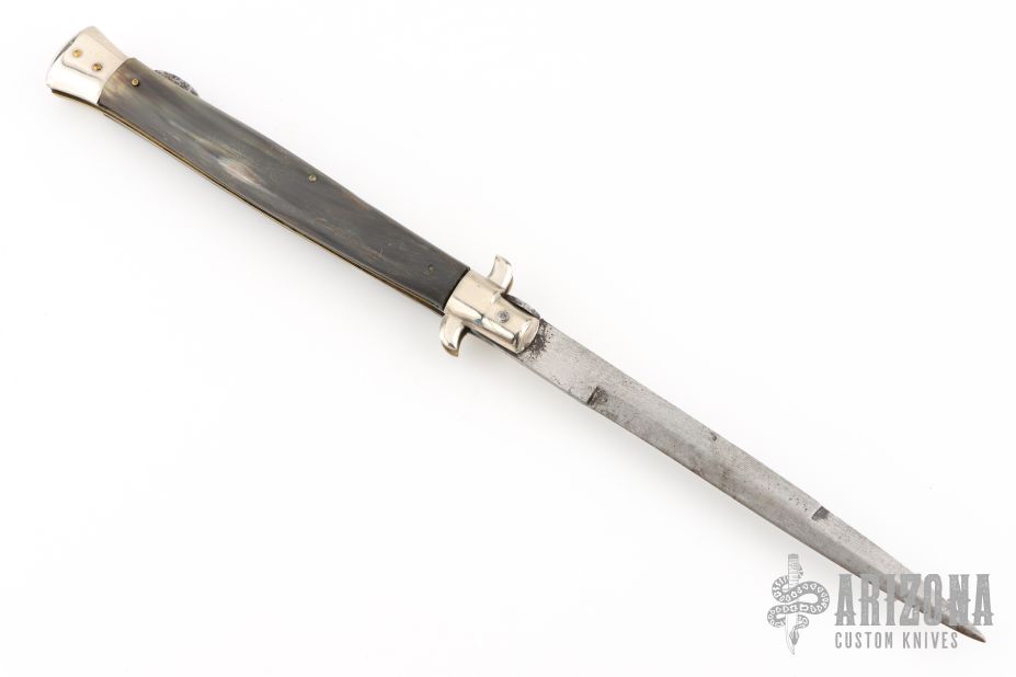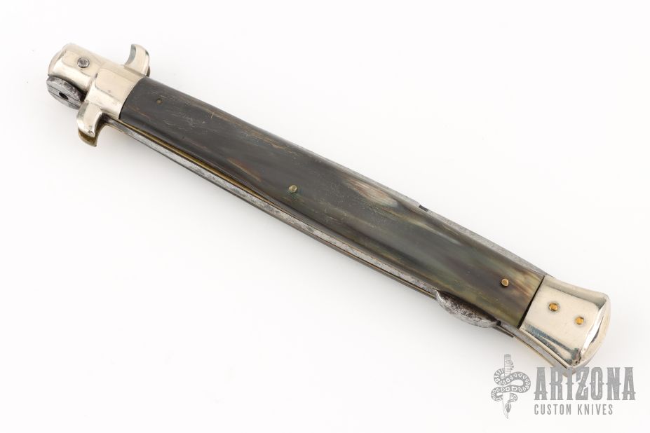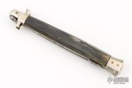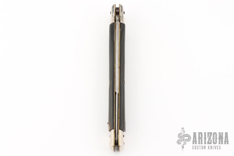 This Lockback features a polished bayonet ground blade with false top edge and nail nick. The handle has nickel silver bolsters, front and rear, stag scales, brass liners, steel rockerbar with pronounced tab. Has patina, scratches, and pitting. Good condition for its age.