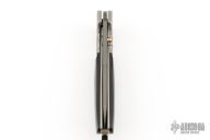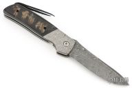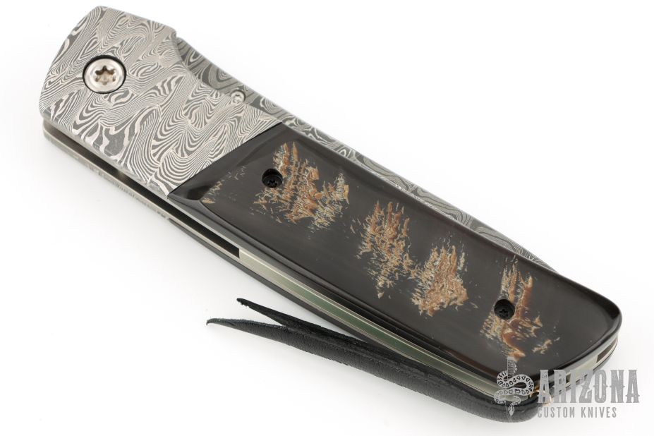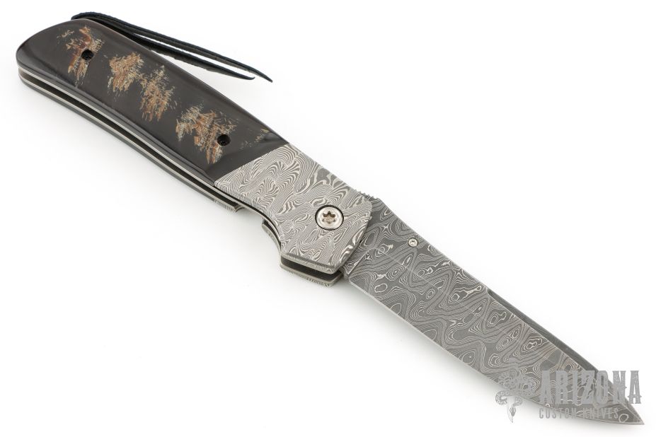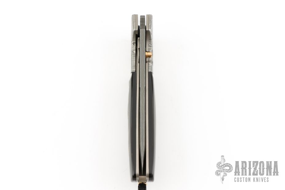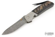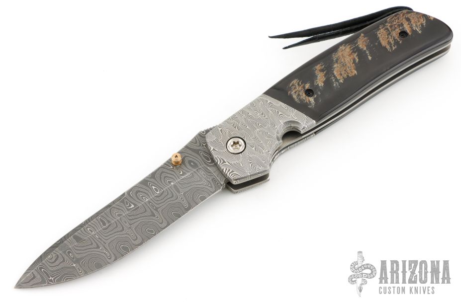 This ATCF by Bob Terzuola features a Damascus blade with notched thumbrest and a gold thumbstud. The handle has mosaic Damascus bolsters, cape buffalo horn scales, blasted titanium liners, titanium backspacer with lanyard pin. Nice detent, lockup, blade seating. Comes with a zippered case. Excellent condition. Originally from the 2008 Plaza Cutlery Show.