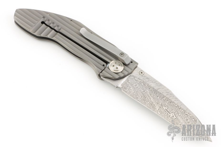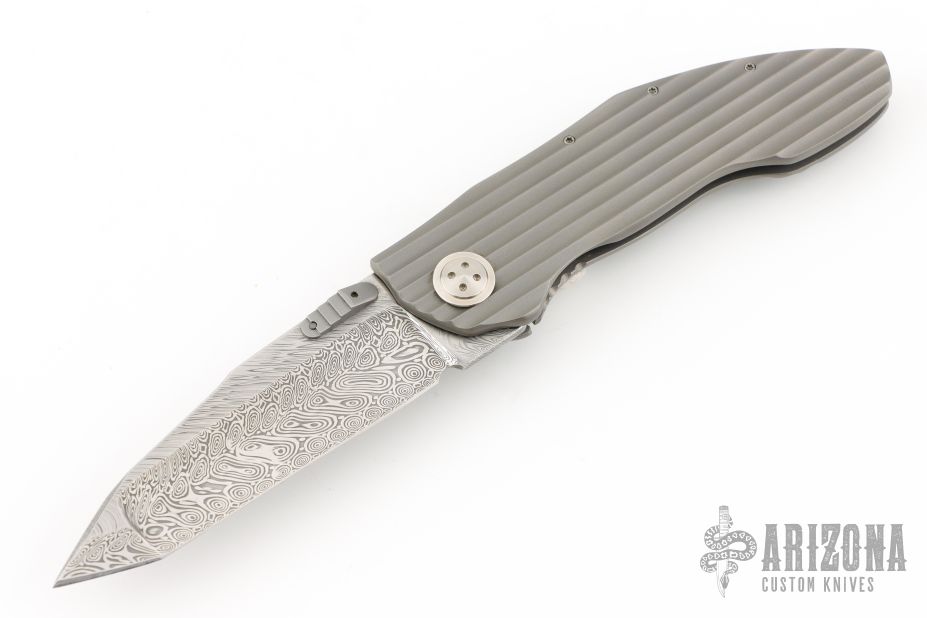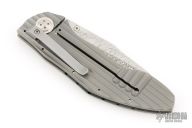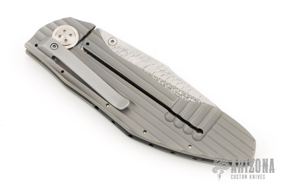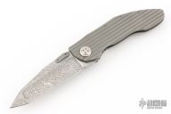 This Creedmore framelock folder by Allen Elishewitz features a Damasteel blade and a grooved titanium thumbthud. The handle has a fluted titanium frame with bead blasted finish, black G-10 backspacer, tip down bead blasted stainless steel clip. Nice detent, lockup and blade seating. Excellent condition. Comes with a leather pouch. Made in 2006.