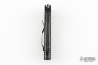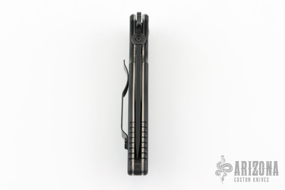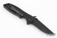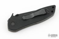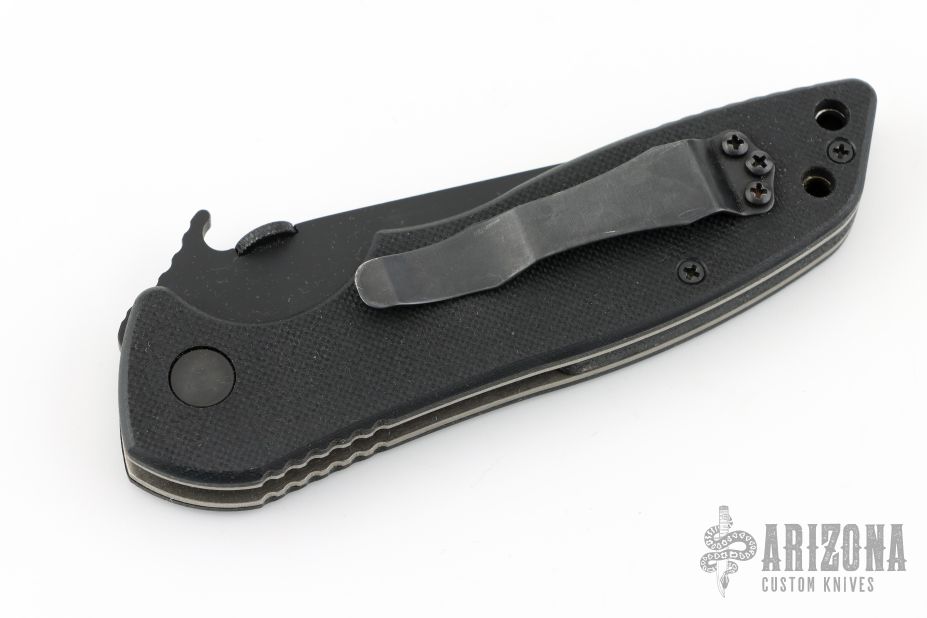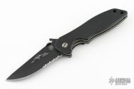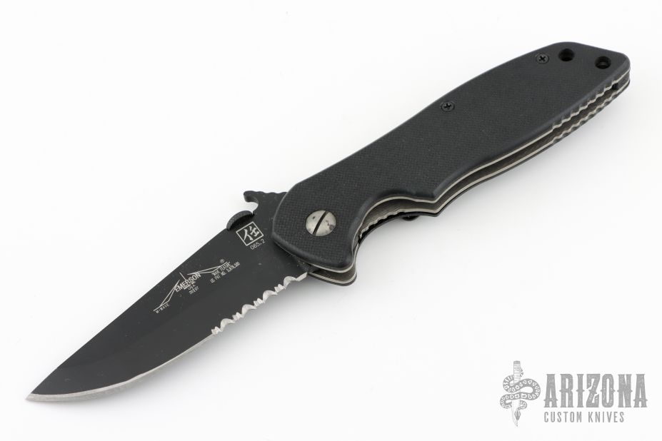 This M-Wave BT by Emerson Knives features a black partially serrated blade with thumb disc and wave feature. Textured black G10 scales over titanium liners, black tip up stainless steel clip. Number 065.2 and dated 2007. Has some scuffs and has been resharpened, otherwise good condition. Comes with original box.