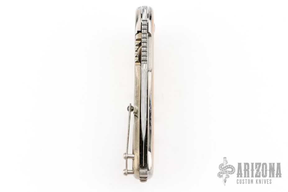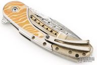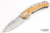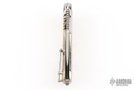 This Bodega flipper by Todd Begg Knives features a Damasteel blade with false top edge. The handle has a polished titanium frame with mokume inlays with cracked ice finished titanium backspacer, tip up pocket clip and pivot collar. Rides on bearings for smooth and fast opening that requires no wrist action. Outstanding work. Excellent condition.