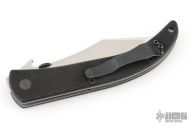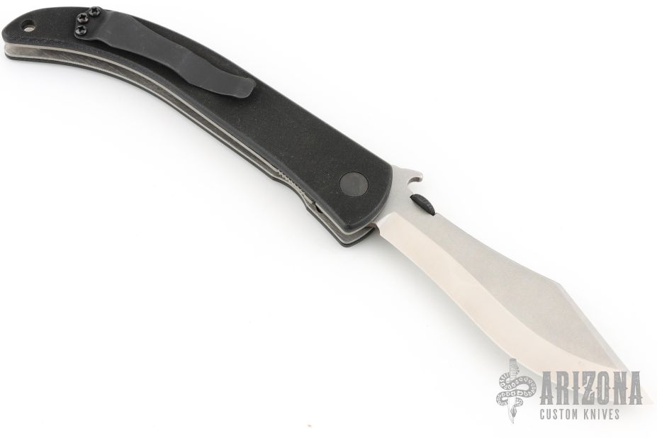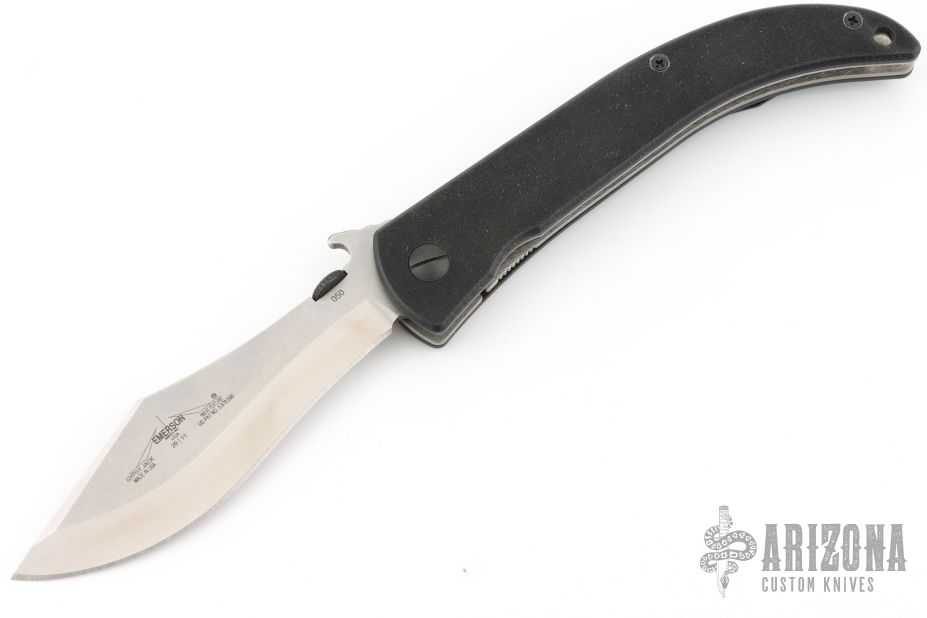 This Gypsy Jack by Emerson Knives features a stonewashed finish blade and black G-10 scales. Black coated stainless steel clip tip up. Thumb disc and Wave feature. S/N 050 and dated 2011. Excellent condition. Comes in original box and papers.