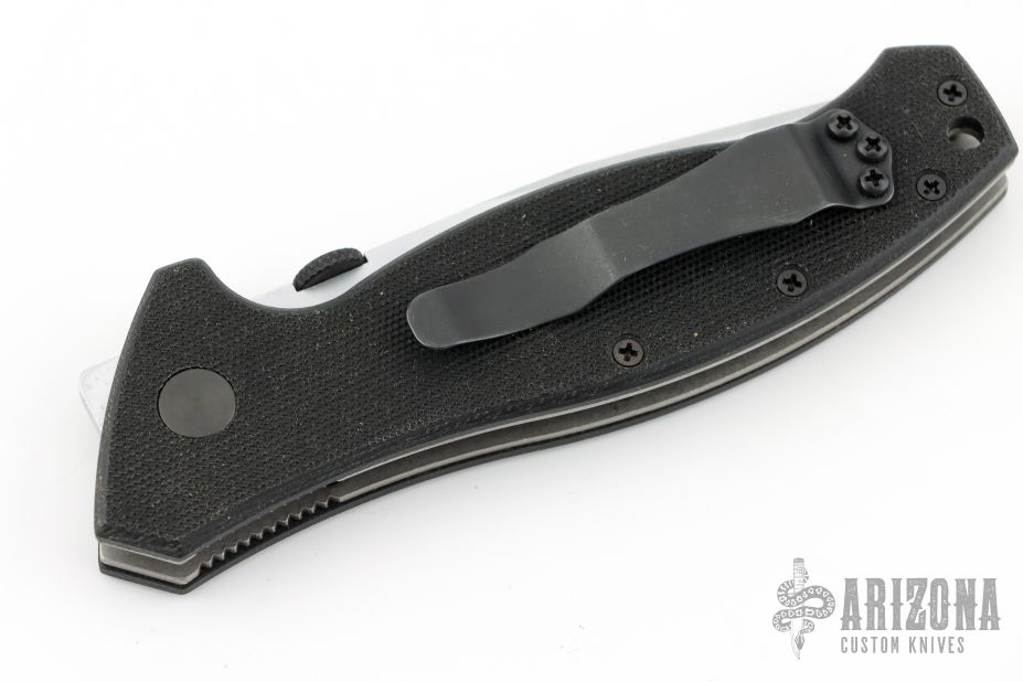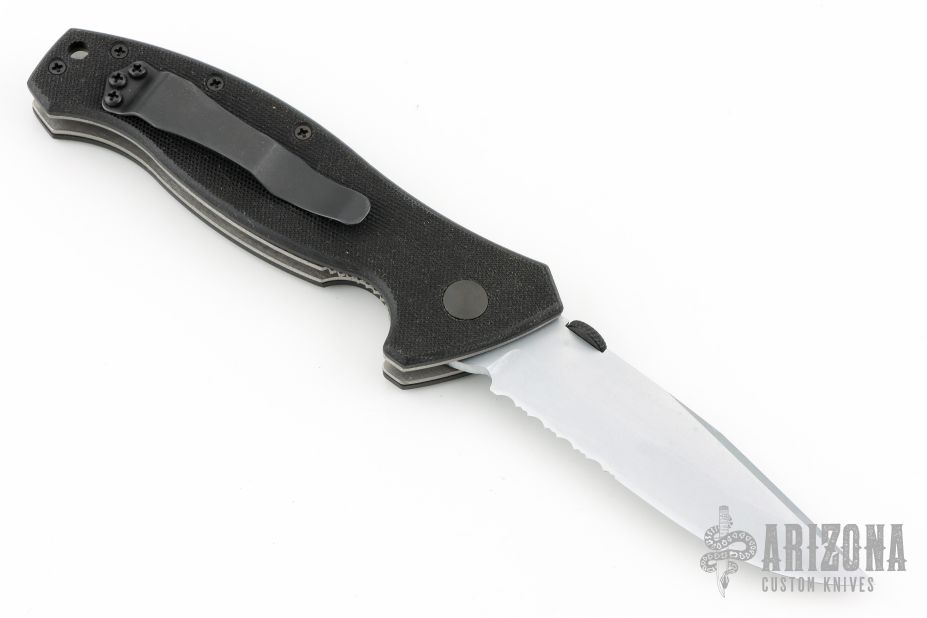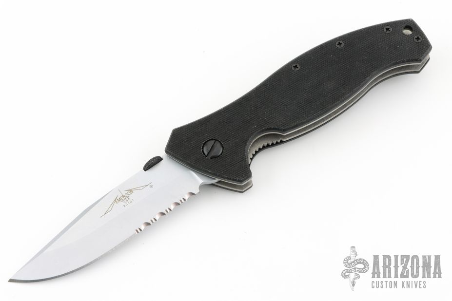 This Specwar-B by Emerson Knives features a silver partially serrated blade with thumb-disc. The handle has Black G-10 scales, titanium liners, and black stainless steel pocket clip. Comes with original box and papers. Excellent condition. The blade is dated 2001.