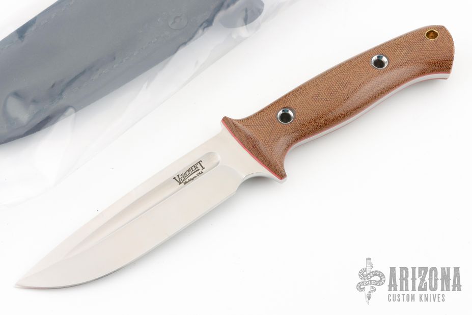 This knife by Vehement Knives features a satin finished spear point blade with a false top edge and fullers, full tang construction, .190" Blade Stock, 1.282" Blade Depth. The handle features gloss natural canvas micarta scales and hollow pins and red liners. Includes a black leather sheath with white stitching. Includes original box and papers. Dated June 30th, 2023. Excellent Condition.