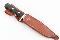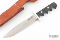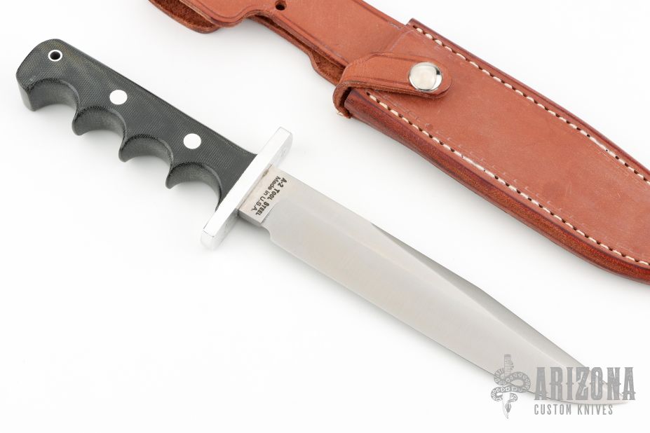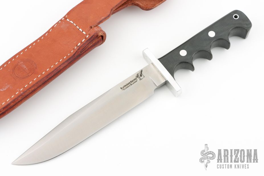 This Model 14 Halo Attack by Blackjack Knives features a satin finished clip point blade with false top edge, .251" blade stock and 1.265" blade depth, full tang construction. The handle has a polished aluminum guard, black canvas micarta grip. Comes with original box and brown leather sheath. Excellent condition.