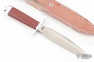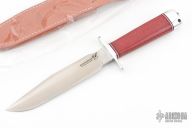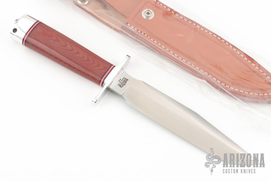 This Model 1-7 by Blackjack Knives features a satin finished blade with false top edge, .219" thick and 1.275" deep, hidden tang construction. Double aluminum guard, red linen micarta grip with black/red/white spacers and an aluminum butt with lanyard hole. Comes with brown leather sheath and original box. Excellent Condition.