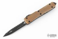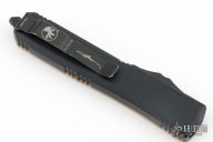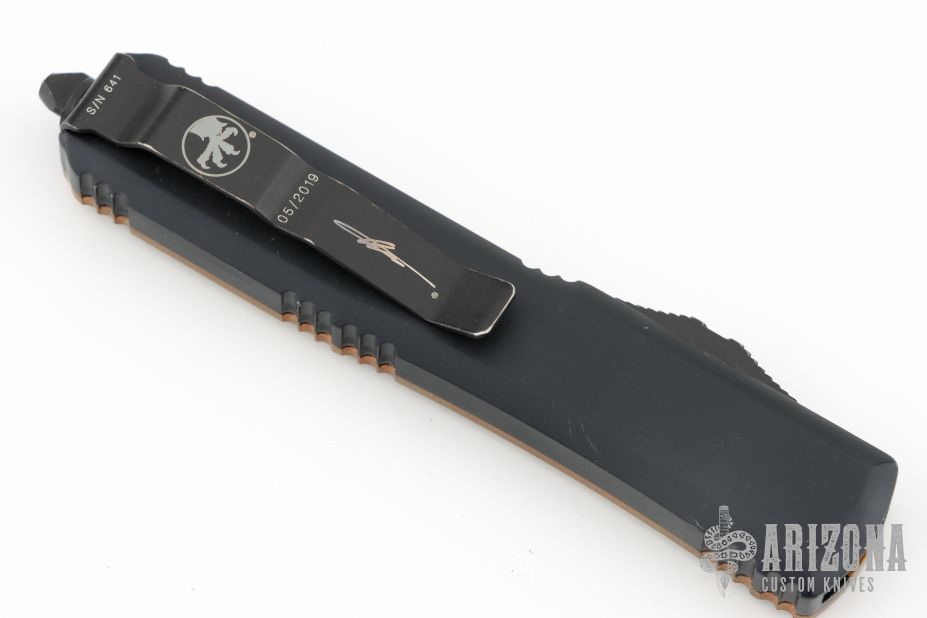 This Ultratech OTF automatic by Microtech features a D/E black blade with one fully serrated edge. Black aluminum contoured frame with copper top, black hardware and tip down stainless steel clip. Dated 05/2019 and s/n 641. Has some scuffs and scratches, otherwise good condition. Includes original box and papers.