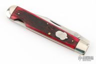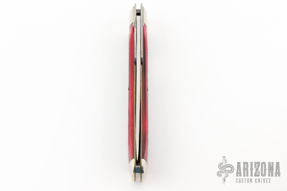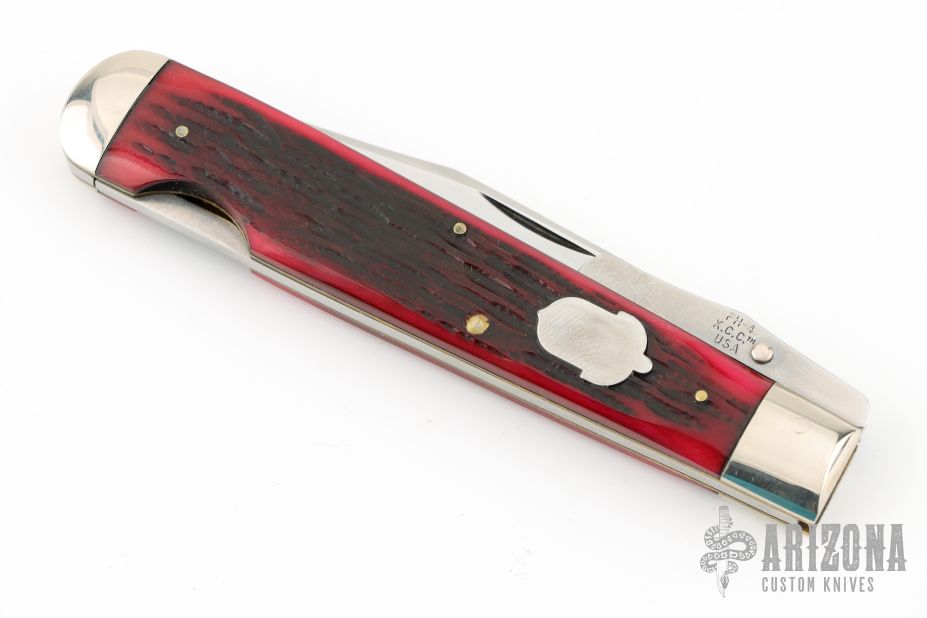 This swing guard by AG Russell and Cattaraugus Cutlery features a mirror polished clip point blade with a single nail nick.  The handle features nickel silver bolsters, dyed jigged bone covers, brass liners and a steel escutcheon.  Includes original box.  Excellent Condition. Dated 1992