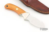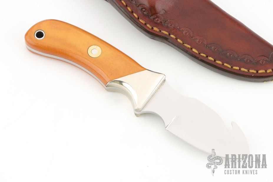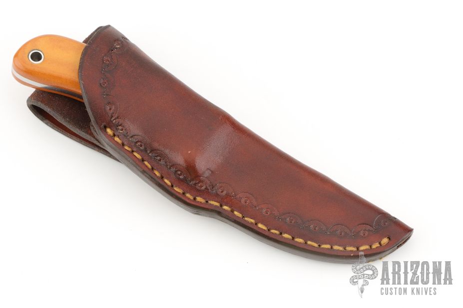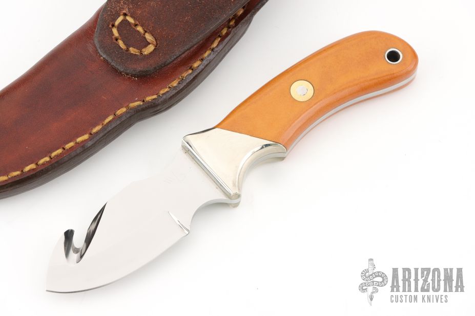 This knife is marked with what looks like "WFB", please let us know if you know who this is. It features a mirror polished blade with guthook, .123" blade stock and 1.028" blade depth, full tang construction. The handle has nickel silver bolsters, yellow paper micarta scales, lanyard hole at the butt. Comes with a hand tooled brown leather sheath. Excellent condition.