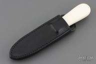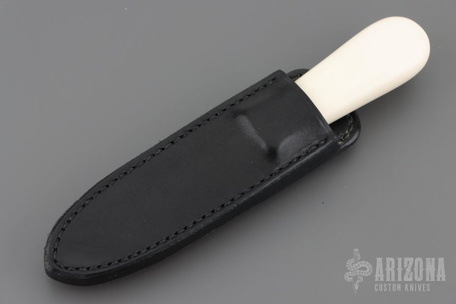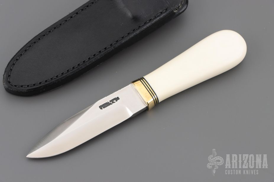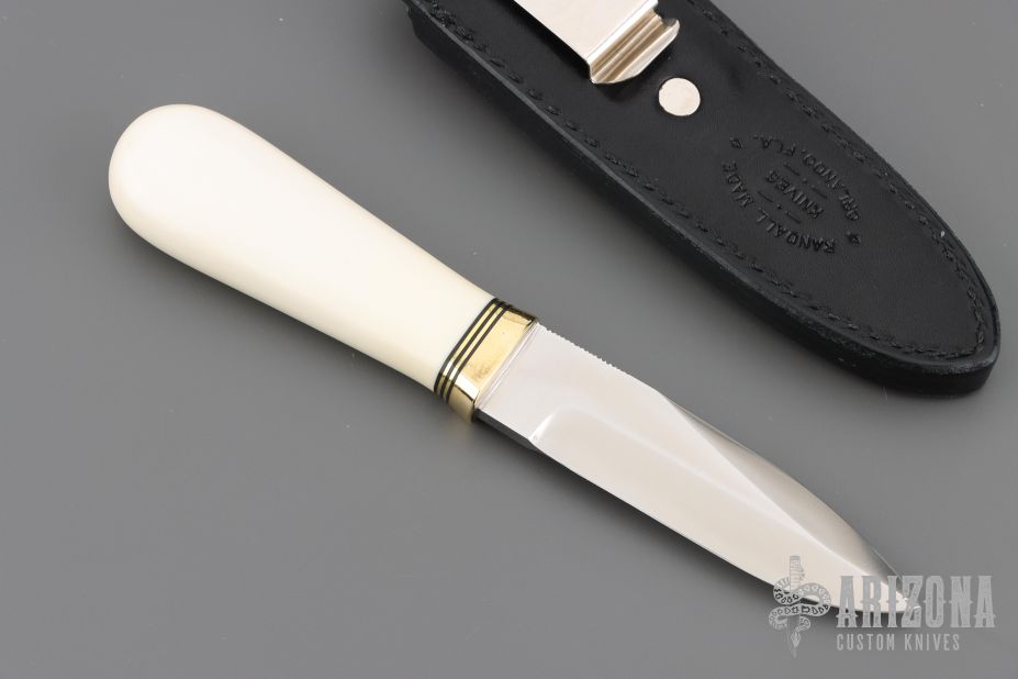 This Gambler by Randall Made Knives features a satin finished blade with .180" blade stock and .960" blade depth, hidden tang construction. Sharpened top edge. Notched thumbrest. Ivorite grip with brass guard, black/brass spacers. The Gambler is one of Randall's non-catalog knives. Black leather sheath with boot clip. Excellent condition.