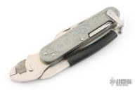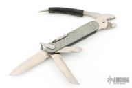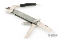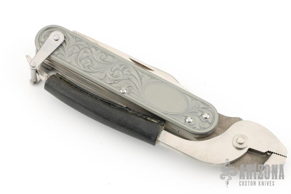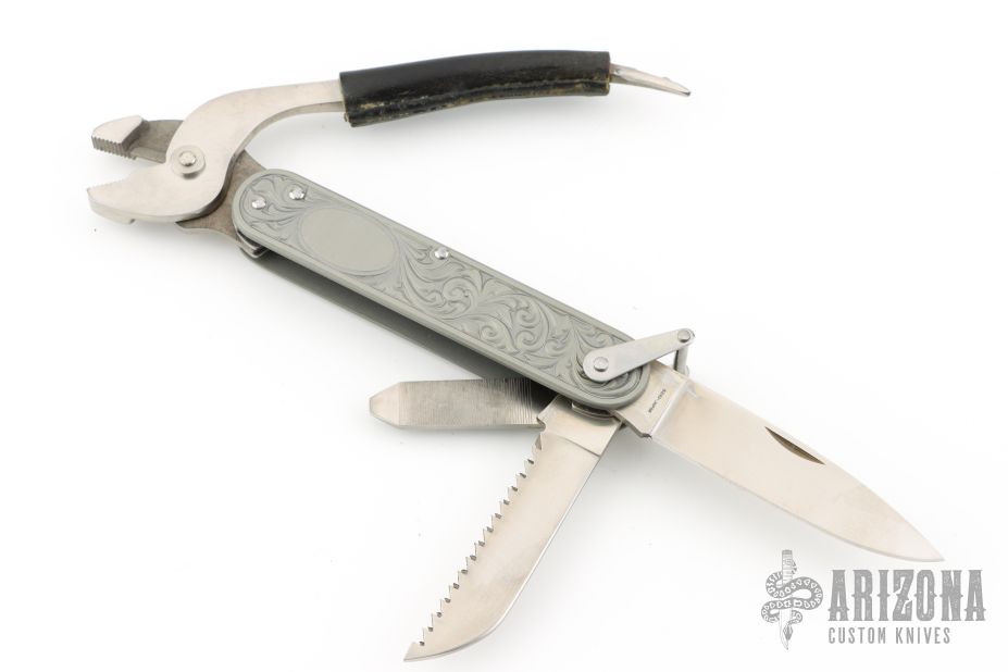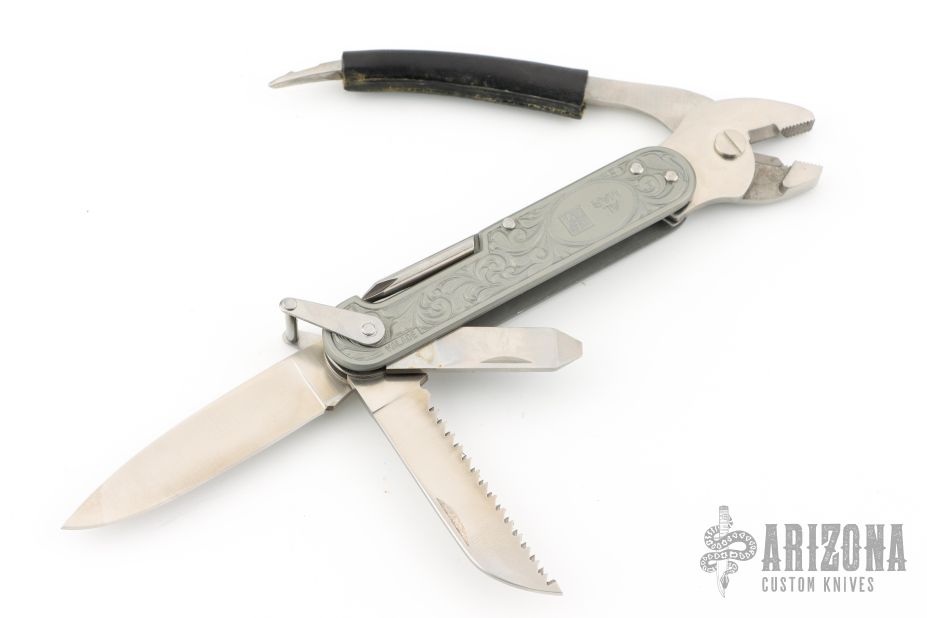 This 4x4 Tool Mate from Al Mark Knives features a drop point blade, a saw blade, nail file/pry bar combo and Phillips head screwdriver. Also includes pliers with a leather wrapped handle. Lanyard bail rotates over the plier handle to lock closed when not in use. The handles have been engraved by Robert Valade. Comes with a black leather sheath and the original box and papers. Excellent condition.